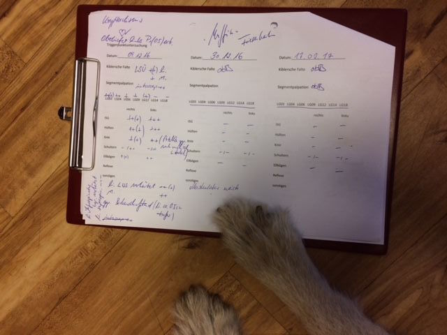 Endlich sind zwei Wochen rum, und es steht wieder ein Ausflug nach Köln an, wo erstmals der Behandlungserfolg überprüft wird. Muffins Frauchen berichtet, dass er wieder die Treppen hoch läuft, er sich viel gerader setzen und legen kann. Aufstehen fällt ihm ebenfalls viel leichter als vorher. Das Hinterteil wackelt zwar noch immer hin und her, aber lange nicht mehr so stark wie vor der Goldakupunktur. Überhaupt ist das gesamte Gangbild viel stabiler. Zur Untermauerung des Erfolges hebt Muffin zum ersten Mal das kranke Hinterbein in bester Kung-Fu-Manier und hinterlässt sein Autogramm in Köln-Deutz. Die Schmerzuntersuchung zeigt, dass er von den Schmerzen vor zwei Wochen so gut wie gar nichts mehr spürt (Foto des Protokolls).