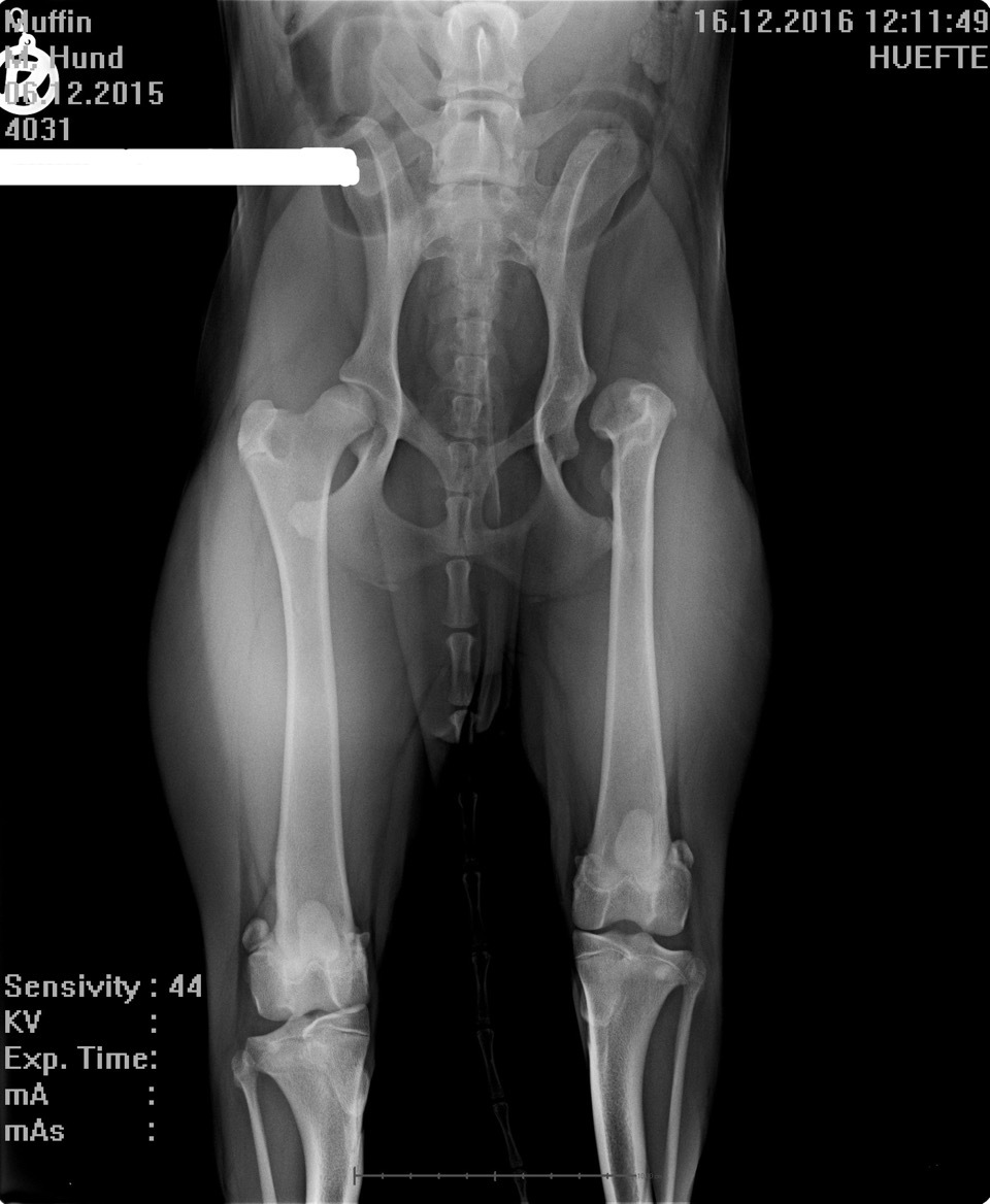 Die Schmerzpunktuntersuchung zeigt, dass er nicht nur an beiden Hüftgelenken, sondern durch seine Gangart auch schon im Rücken, an beiden Kniegelenken und aufgrund der Verlagerung seines Gewichtes nach vorne sogar in der Vorderhand Schmerzen hat. Muffins Frauchen ist verzweifelt und muss aus Mitleid mit ihrem Liebling weinen - er ist doch noch so jung. Alle schmerzhaften Bereiche müssen geröntgt werden, um zu sehen, was los ist und was die Schmerzen verursacht. Muffin ist ganz lieb und hält brav still, als er nach dem Abhorchen seines Herzens einen Venenkatheter in die Vene geschoben bekommt. Es pickst kurz, und innerhalb von ein paar Minuten sinkt er in die Arme von Frauchen. Er schläft ruhig und sanft ein, damit er schmerzlos und ordentlich gelagert geröntgt werden kann. Die Diagnosen sind niederschmetternd für sein Frauchen.