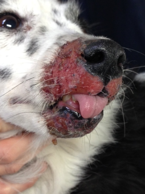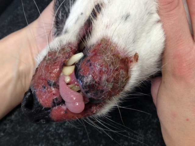 Die spezielle dermatologische Untersuchung zeigte einen Pigmentverlust, Krusten, geschwürige Veränderungen und teilweise sogar blasige Aufwerfungen der Haut. An den veränderten Arealen waren bis auf einige Sinushaare fast sämtliche Haare ausgegangen, und die Haut nässte und blutete sofort bei Berührung (Abb. 1&2)