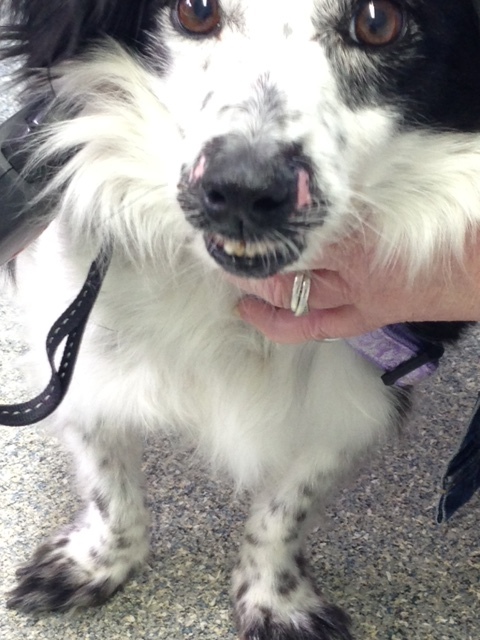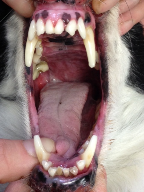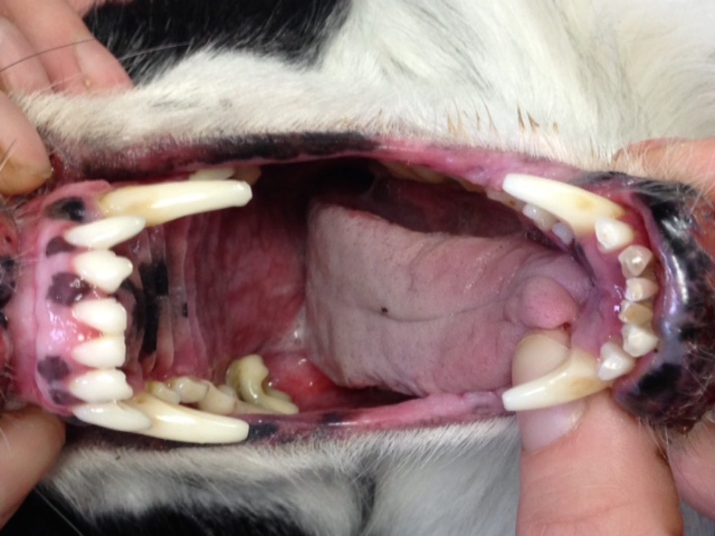 Auffallend war, dass die Hautveränderungen auf den Kopf beschränkt waren. Sie breiteten sich symmetrisch vom Nasenrücken über die Oberlippen bis zu den Unterlippen und dem Kinn aus. Auch in den inneren Augenwinkeln waren geringe Krustenbildungen und Entzündungrn zu sehen. Bei der genaueren Untersuchung fielen auch fleckige Rötungen in der Mundhöhle (Abb. 3) und vergrößerte Lymphknoten im Kehlgangs auf. Außerdem hatte „Klärchen“ sehr schlechte Zähne.