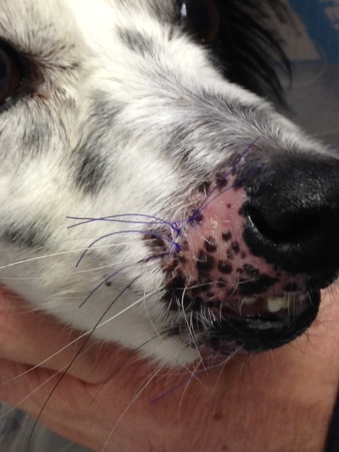 Differentialdiagnostisch kamen infektiöse Ursachen (Pilze, Bakterien), Parasiten (z.B. Leishmanien, das sind Erreger, die vor allem im südlichen Ausland durch spezielle Schmetterlingsmücken übertragen werden), Fremdkörperreaktionen, immunvermittelte Erkrankungen, aber auch Hauttumore in Frage. Da die Veränderungen hochgradig und chronisch waren und es in Anbetracht des fortgeschrittenen Alters von „Klärchen“ sehr wichtig war, einen Tumor der Haut (Lymphom) auszuschließen, wurde eine Hautbiopsie durchgeführt. Hierbei werden unter Allgemeinanästhesie mehrere Proben aus den befallenen Areale gestanzt und diese an ein Speziallabor zur patho-histologischen Untersuchung gegeben. Das Labor fertigt aus den fixierten Hautstücken mehre Schnitte an und führt Spezialfärbungen durch.