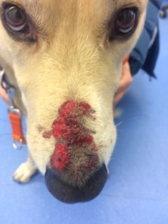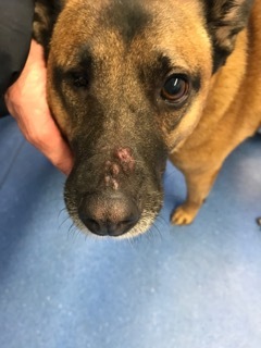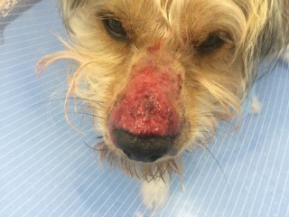 Auch die überwiegend in den warmen Monaten auftretende eosinophile Furunkulose kann durch Kontakt mit Flöhen oder andere stechende Insekten ausgelöst werden (9). In einem Laubhaufen, Dickicht oder Ähnlichem kann es zu Kontakt mit Insekten kommen, welche durch einen Stich oder Biss die Krankheit auslösen. Vor allem auf dem Nasenrücken kann es zum akuten Anschwellen der Haut, mit nässenden, rötlichen Arealen und kleinen Erhabenheit kommen (5). Die Hautentzündung kann jucken oder nur schmerzhaft sein. Auf einem Abklatschpräparat kann der Tierarzt eine spezielle Art von weissen Blutkörperchen, sogenannte eosinophile Granulozyten entdecken, welche bei Kontakt zu Parasiten in die Haut ausrücken, um vor Ort gegen diese vorzugehen (6). Nach erfolgter Diagnosestellung wird der Patient temporär mit antientzündlichen oder juckreizlindernden Medikamenten, sowie längerfristig mit einem Präparat gegen Flöhe, Zecken und Milben behandelt (5, 9).