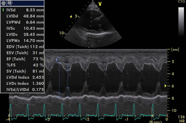 Die letzte Herzultraschalluntersuchung lag über 10 Monate zurück, und zu diesem Zeitpunkt zeigte der Hund keinerlei Symptome einer Herzerkrankung. Entsprechend der speziell für Hunde entwickelten Einteilung des Schweregrades einer Herzinsuffizienz durch eine Mitralklappenendokardiose befand sich Alf damals im CHIEF - Stadium B2 *. Wie es üblich ist, wurde daher mit einer Herztherapie begonnen, um dem weiteren Fortschreiten der Erkrankung entgegen zu wirken (in diesem Fall mit Benazepril und Spironolacton). Zu einer Kontrolluntersuchung mittels Herzultraschall wurde nach sechs Monaten geraten.
