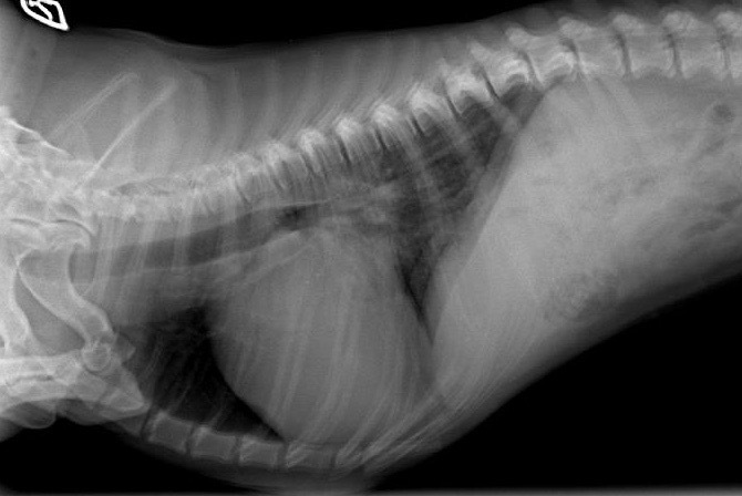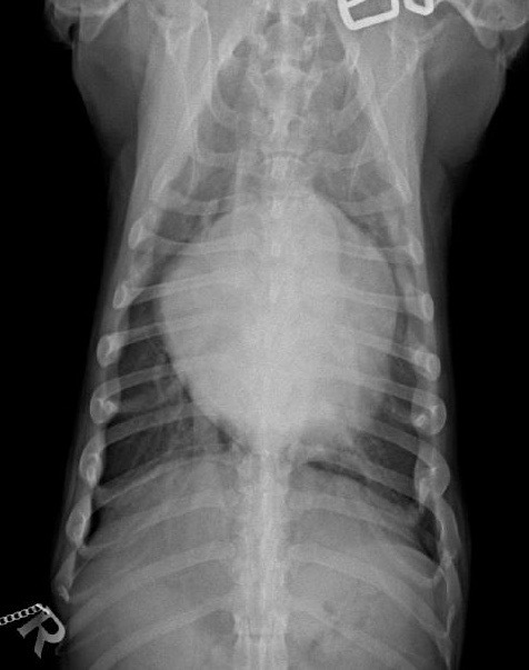 Als mir Alf noch am gleichen Tag zur Untersuchung vorgestellt wurde, berichtete die Besitzerin davon, dass ihr seit ein paar Tagen ab und zu eine schnellere Atmung aufgefallen war und der Rüde auch etwas weniger Appetit hatte als sonst. „Herzhusten“ - oder überhaupt Husten - hingegen hatte der Hund nicht gezeigt, und er war insgesamt sehr munter. Beim Abhören des Herzens fiel sofort ein sehr lautes systolisches Herzgeräusch auf, das auch mit der Hand am seitlichen Brustkorb als Vibration (ein sogenanntes „Schwirren“) zu fühlen war. Die Herzfrequenz war außerdem erhöht (Tachykardie), der Herzrhythmus regelmäßig.