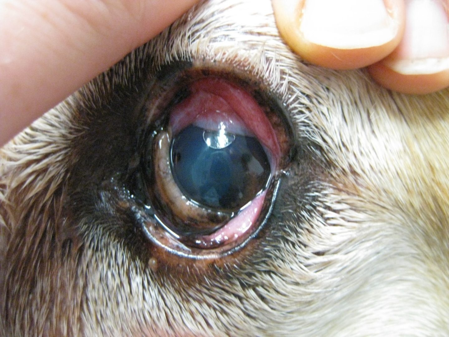 Die Hornhaut besteht aus mehreren Schichten. Oben oder außen sind mehrere Lagen von Zellen, darunter liegt das deutlich dickere Hornhautstroma und ganz innen eine dünne Membran mit einer einlagigen Zellschicht. Sobald die oberste mehrlagige Zellschicht beschädigt ist, spricht man von einem Hornhautdefekt. Man kann auch Verletzung oder Ulkus sagen. Hornhautdefekte färben sich mit Fluoreszein an. Solange nur die oberflächliche Zellschicht betroffen ist, handelt es sich um einen oberflächliches Ulkus. Wenn auch das darunterliegende Stroma mitbetroffen ist, spricht man von einem tiefen Ulkus, dessen Behandlung häufig sehr intensiv und aufwendig ist. Wenn ein oberflächlicher Defekt vorliegt und keine anhaltende Ursache besteht, die ein Abheilen unmöglich macht (wie z.B. reibende Haare, eine zu geringe Tränenproduktion etc.) heilt der Defekt in der Regel innerhalb von wenigen Tagen ab. Wenn keine bestimmte Ursache vorliegt, aber der oberflächliche Defekt trotzdem nicht innerhalb von 1-2 Wochen abheilt, handelt es sich häufig um ein nicht heilendes Hornhautulkus oder SCCED. Dies war bei Titus - wie bei vielen älteren Hunden - der Fall. Es war auch nur die oberste Schicht betroffen und es gab keine spezifische Ursache. Jedoch lagen die Zellen dieser obersten Hornhautschicht nur lose auf dem Stroma auf. Die Zellen versuchten über den Defekt zu wachsen, um diesen zu verschließen. Da sie aber nicht fest verankert waren, schafften sie es immer nur den Defekt ein bisschen kleiner werden zu lassen, nur um sich einige Tage später wieder ganz zu lösen, sodass der Defekt wieder viel größer wurde. Auch Blutgefäße wuchsen in die Hornhaut von Titus ein und gaben der Hornhaut somit an der verletzten Stelle ein rotes Aussehen (Bild 2 & 3). Diese Gefäße sind ein weiterer Versuch des Auges den Defekt zum Abheilen zu bringen. Sie sind nicht immer vorhanden.