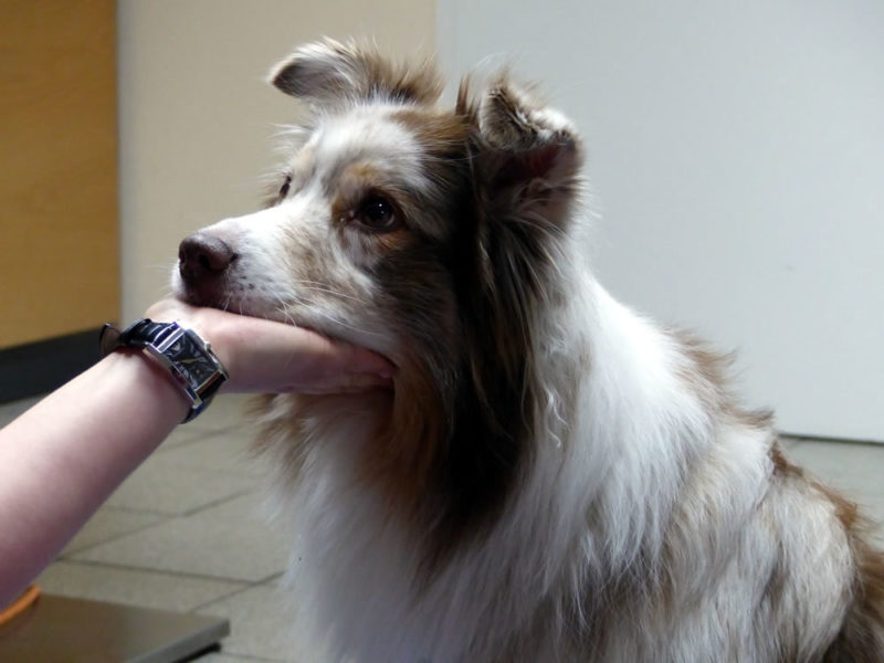 Sie selbst können in jeder Situation viel tun, um Ihrem Hund zu helfen, sich in der Tierarztpraxis wohl zu fühlen. Die emotionale und körperliche Balance wechselwirken immer miteinander. Das heißt, je wohler sich Ihr Hund in seinem Körper fühlt, desto besser kann er mit aufregenden Erlebnissen umgehen. Die Tellington TTouch® Methode setzt spezielle sanfte und effektive Berührungen ein, die Ihrem Hund helfen, gelassen zu bleiben. Eine leicht zu erlernende Technik ist der sogenannte Ohren-TTouch. Nehmen Sie hierfür ein Ohr Ihres Hundes zwischen Daumen und Zeigefinger und streichen Sie mit einer ruhigen Bewegung von der Ohrbasis zur Ohrspitze. Folgen Sie dabei der natürlichen Ohrform Ihres Hundes: bei Stehohren streichen Sie nach oben, bei Schlappohren nach unten. Im Ohr befinden sich zahlreiche Akupunkturpunkte, so dass über das Ausstreichen sowohl das Verhalten beeinflusst werden kann, als auch der Kreislauf stabilisiert werden. Daher ist diese Technik auch sehr gut geeignet, Ihr Tier nach einer Narkose zu unterstützen, gut wieder „auf die Pfoten“ zu kommen. Achten Sie darauf das Ohr sanft und nur mit leichtem Druck auszustreichen und selber deutlich auszuatmen. Aufgeregte oder ängstliche Hunde halten entweder die Luft an oder hecheln. Ein Ausatmen des Menschen überträgt sich häufig auf den Hund und führt dazu, dass dieser auch ruhiger atmet und sich dadurch entspannt.