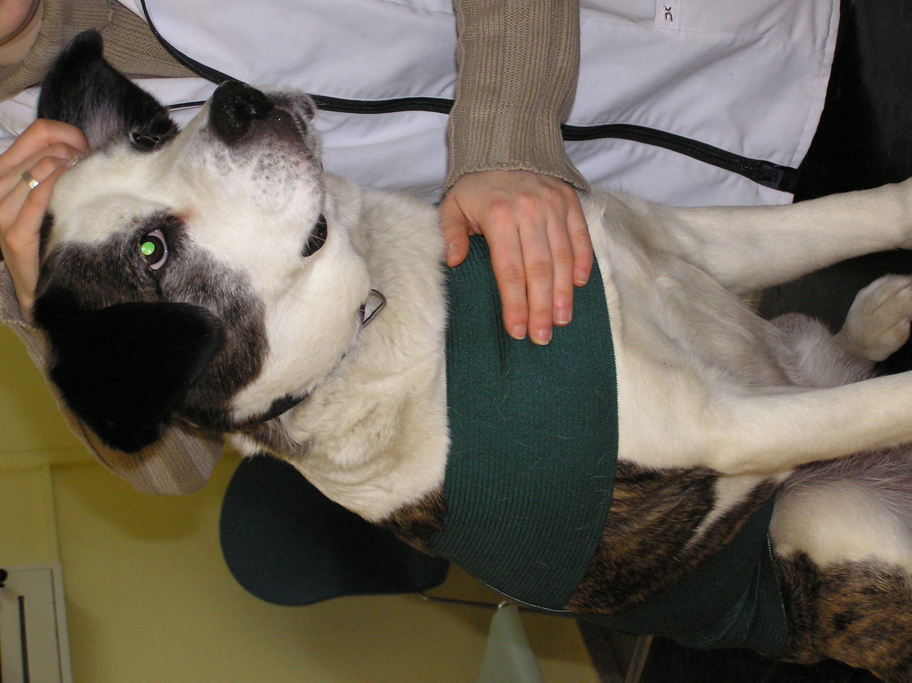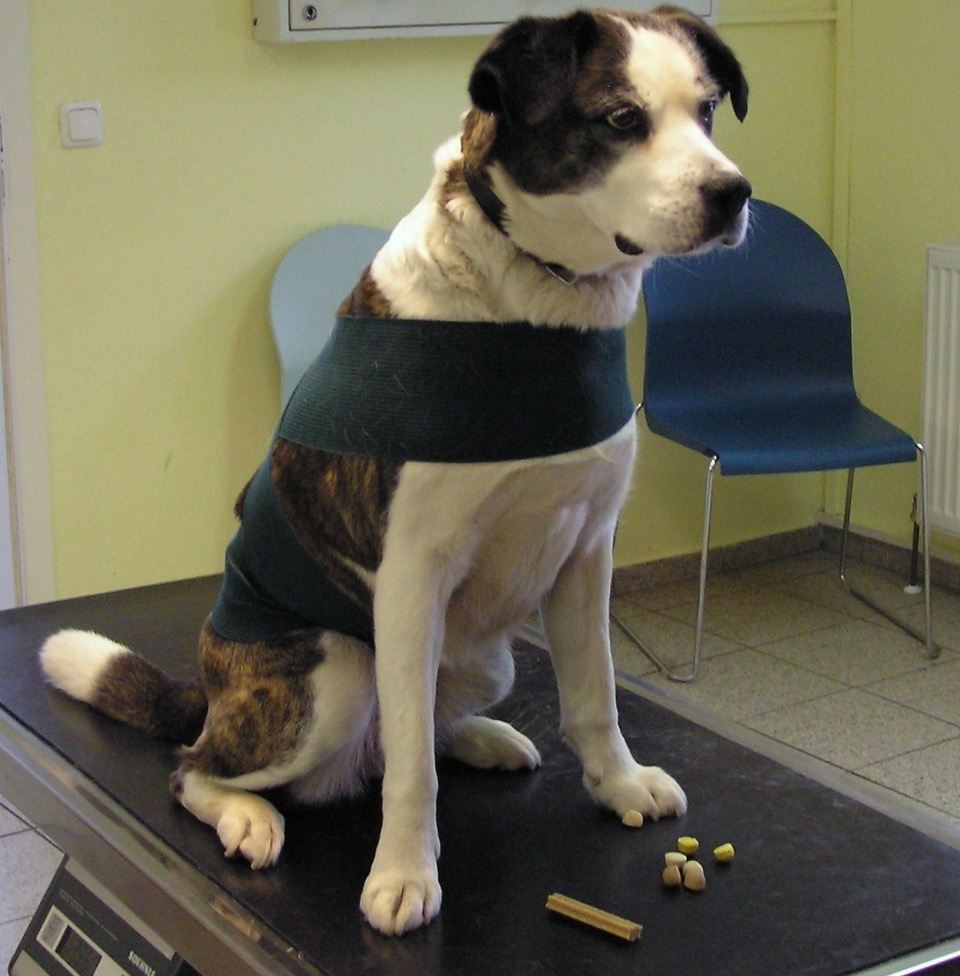 Neben den sanften Berührungen eignen sich die Tellington-Körperbänder, um den Hund in der Tierarztpraxis zu unterstützen. Diese sind besonders nützlich, wenn Sie nicht bei allen Untersuchungen dabei sein können oder wenn Ihr Hund längere Zeit ruhig halten muss, z. B. bei einer Ultraschalluntersuchung oder bei einer Infusionsbehandlung. Der elastische Kontakt des Tellington-Körperbandes wirkt auf die meisten Hunde beruhigend und entspannend. Die Körperbänder stören die tierärztliche Untersuchung in aller Regel nicht, da sie leicht vor und zurückgeschoben werden können. Es gibt zahlreiche unterschiedliche Anlagetechniken. Für den Tierarztbesuch reicht es meist, das Körperband in Form einer ACHT um den Brustkorb zu legen. Je nach Hundegröße werden unterschiedliche breite Körperbänder eingesetzt - für kleine Hunde eignen sich Körperbänder von vier - sechs Zentimeter Breite, für mittelgroße acht Zentimeter und für große Hunde zehn Zentimeter.