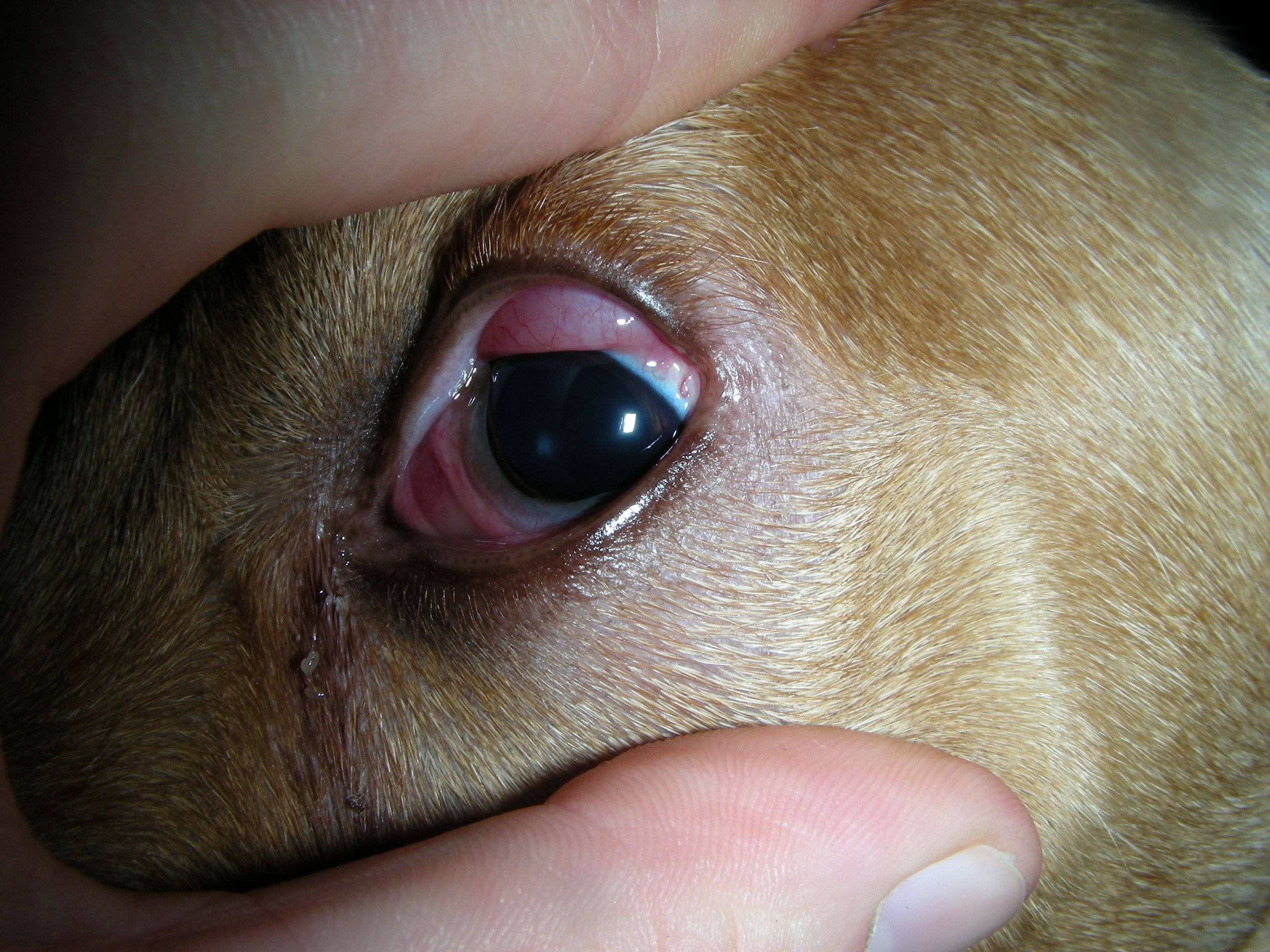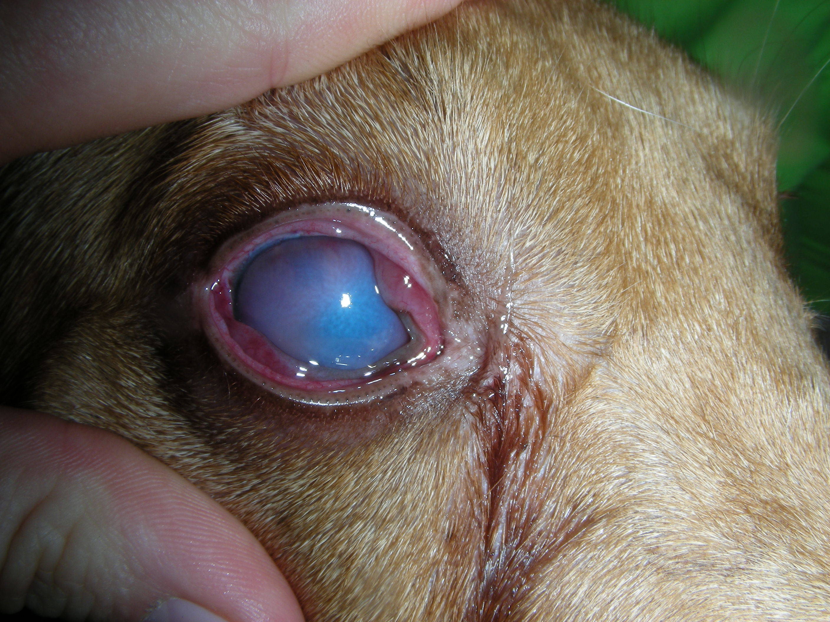 Eine Woche später sei es ihm sehr schlecht gegangen. Er wurde daraufhin auf Initiative der Besitzer in einer Tierklinik vorgestellt. Chicos rechtes Auge war zu diesem Zeitpunkt bereits ganz trüb. Ohne eine genaue Diagnose wurden in der Tierklinik die entzündungshemmenden Augentropfen abgesetzt und durch pflegende und antibiotische Augentropfen ersetzt. Hiermit ging es Chico jedoch keinesfalls besser, er war sehr matt, schlief viel und war berührungsempfindlich am Kopf. Bei der geplanten Kontrolluntersuchung eine Woche später wurde dann ein erhöhter Augeninnendruck festgestellt. Nun sollten drucksenkende Medikamente verabreicht werden.