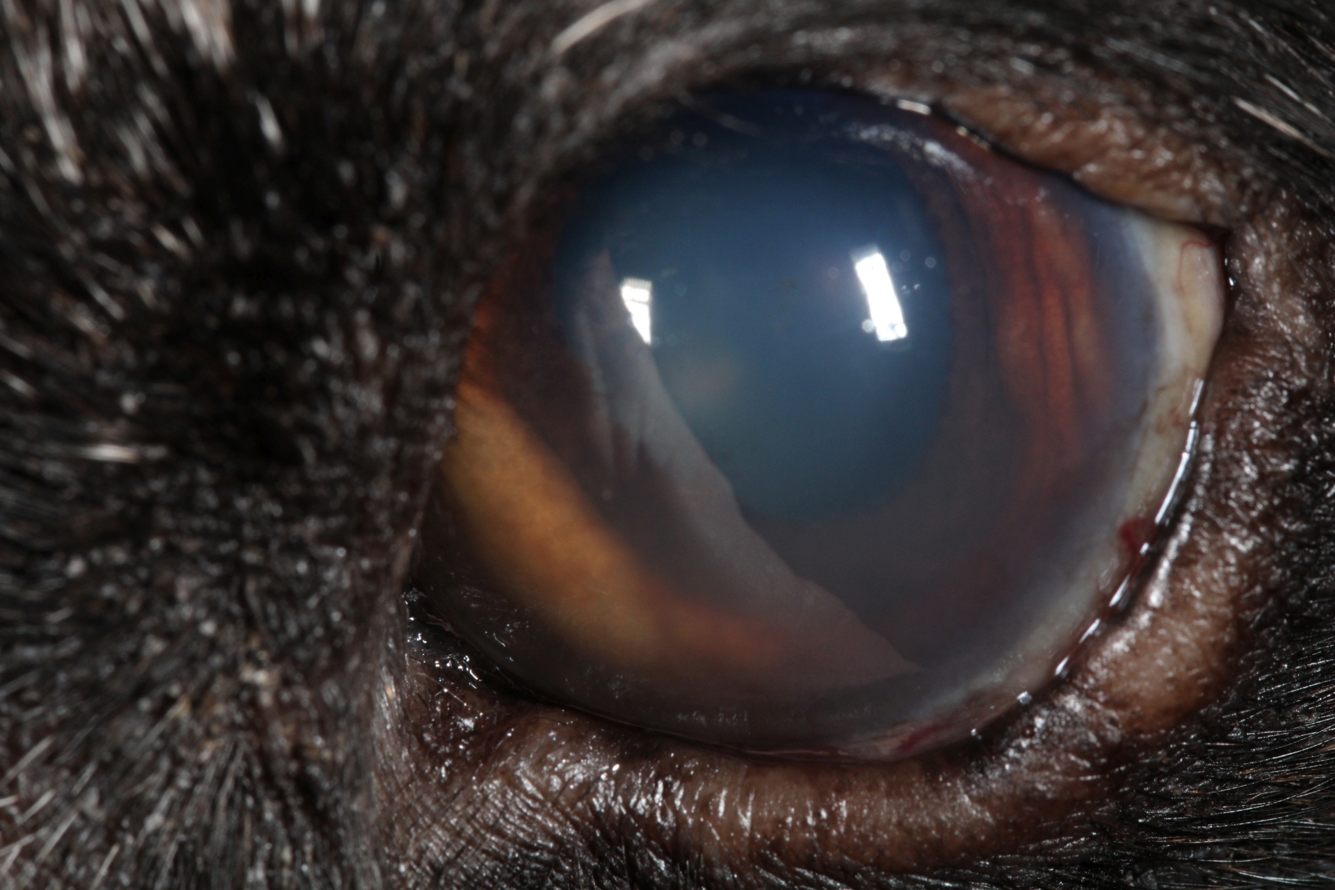 An diesem Montag morgen kam Chico dann in unsere Augenpraxis. In der Augenuntersuchung wurde zunächst seine Sehfähigkeit überprüft. Chicos rechtes Auge war leider bereits erblindet. Beide Augen tränten stark und wurden zugekniffen, die Bindehäute waren hochgradig gerötet und geschwollen, und am rechten Auge war die Hornhaut so trüb, dass man in das Auge selbst nicht hineinschauen konnte (Abb. 2, 3). Die Messung des Augeninnendrucks mit einem speziellen Gerät (Tonovet®) ergab einen Wert von 83 mmHg am rechten und 14 mmHg am linken Auge (Normalwert: 10 bis 20 mmHg).