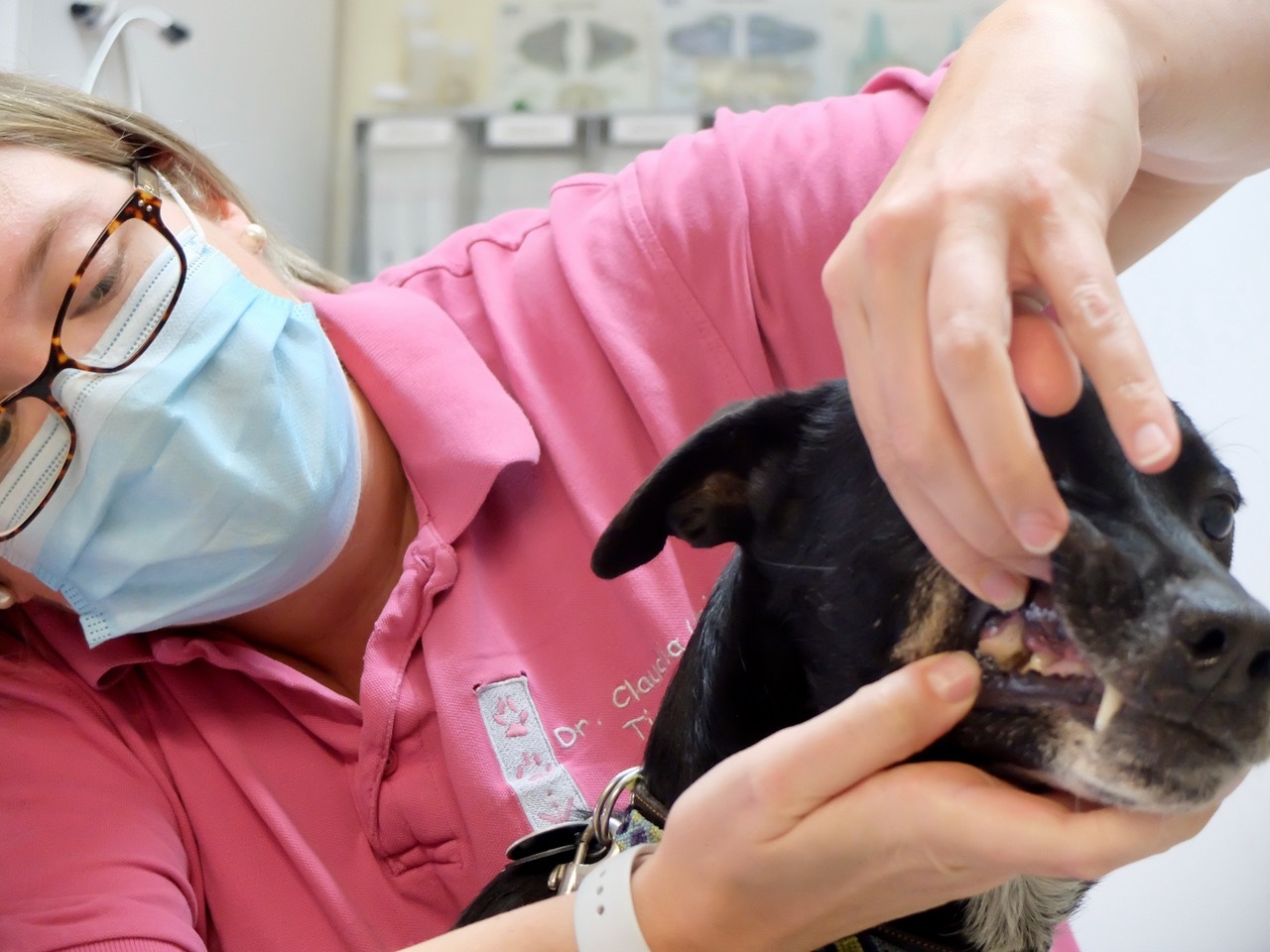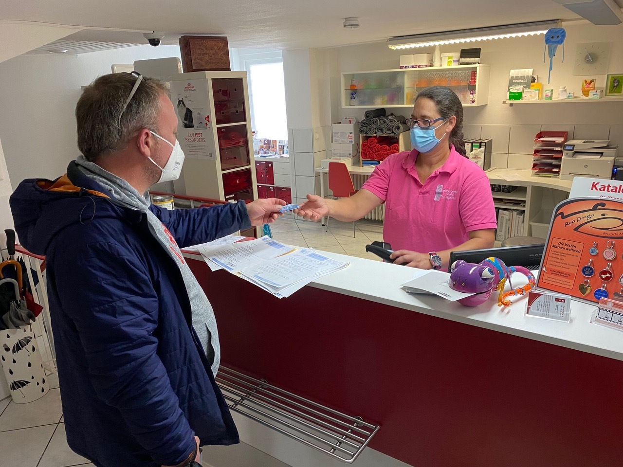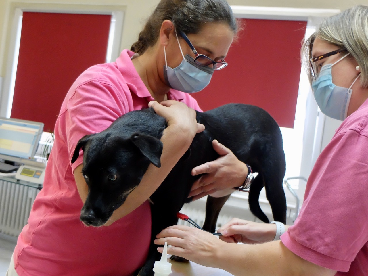 Danach muss der Patient auf den Behandlungstisch - es erfolgt ein erster kurzer Check-Up. Neben der Überprüfung des Mikrochips geht es erstmal darum, sich einen ersten Überblick über das Tier zu verschaffen. Zunächst schaue ich mir ihr Fell an. Ist es schuppig oder glänzt das Fell? Ich frage nach dem Trink- und Fressverhalten sowie den Ausscheidungen. Wie oft uriniert er, ist der Kot immer fest und von gleicher Menge und Farbe? Bei der weiteren Untersuchung wird auf die Zähne, Augen und Ohren und etwaige Entzündungen geachtet. Des Weiteren werden Herz und Lunge auskultiert und der Bauchraum einmal durchgetastet. Oft handelt es sich bei Tieren aus dem Ausland um ältere Tiere, sodass es gerade bei den Zähnen oder dem Herzen schon mal Auffälligkeiten geben kann. Auch die Körpertemperatur wird gemessen. Es empfiehlt sich, dies auch zu Hause immer mal wieder zu "üben", damit die Tiere solche Handgriffe auch schon kennen und bei der Untersuchung als weniger schlimm empfinden.