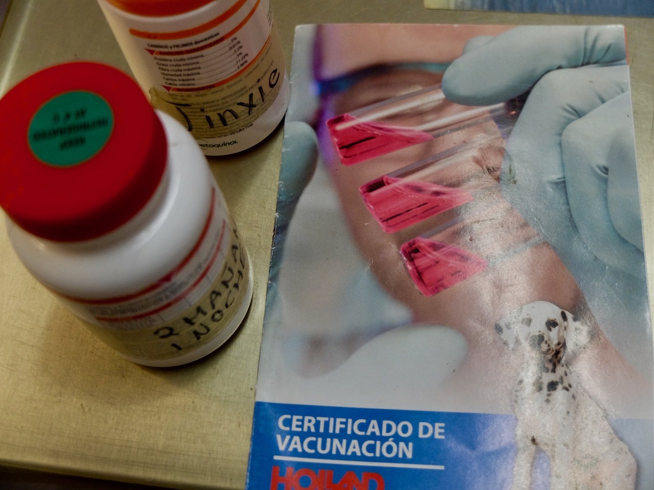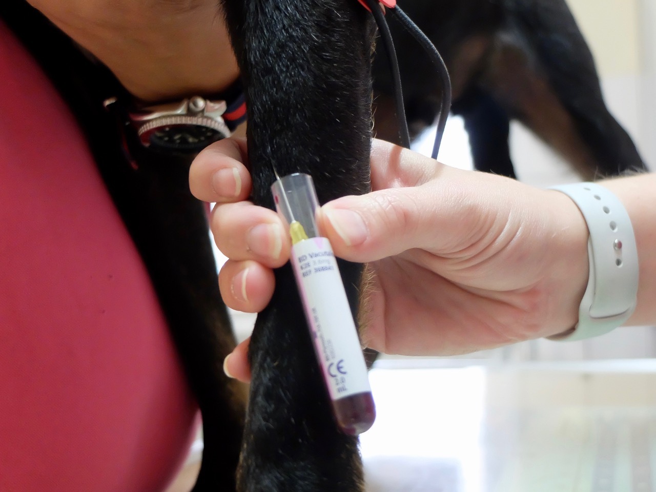 Aufgrund „Jinxies“ Vorgeschichte nehmen wir noch Blut ab, um zu sehen, wie sich die Nierenerkrankung und seine Anämie weiter entwickelt haben. Vorsichtshalber nehmen wir etwas mehr Blut ab, um gegebenenfalls noch auf sogenannte Reise- oder Mittelmeerkrankheiten zu testen, die die Ursache für gesundheitliche Probleme sein könnten. Reise-, bzw. Mittelmeerkrankheiten kommen, anders als es der Name vermuten lässt, mittlerweile auch in Deutschland vor. Aber Tiere, die im Ausland geboren wurden, haben je nach Land ein deutlich erhöhtes Risiko daran zu erkranken. Daher sollte jedes Tier, welches importiert wurde, nach sechs Monaten auf die Krankheiten getestet werden, da auch wir Menschen daran erkranken können. Außerdem sollte eine regelmäßige Floh- und Zeckenprohylaxe erfolgen, damit die Tiere, sollten sie noch nicht daran erkrankt sein, nicht angesteckt werden. Danach überprüfe ich noch „Jinxies“ Impfausweis, um dem Besitzer sagen zu können, wann die nächsten Impfungen fällig sind.