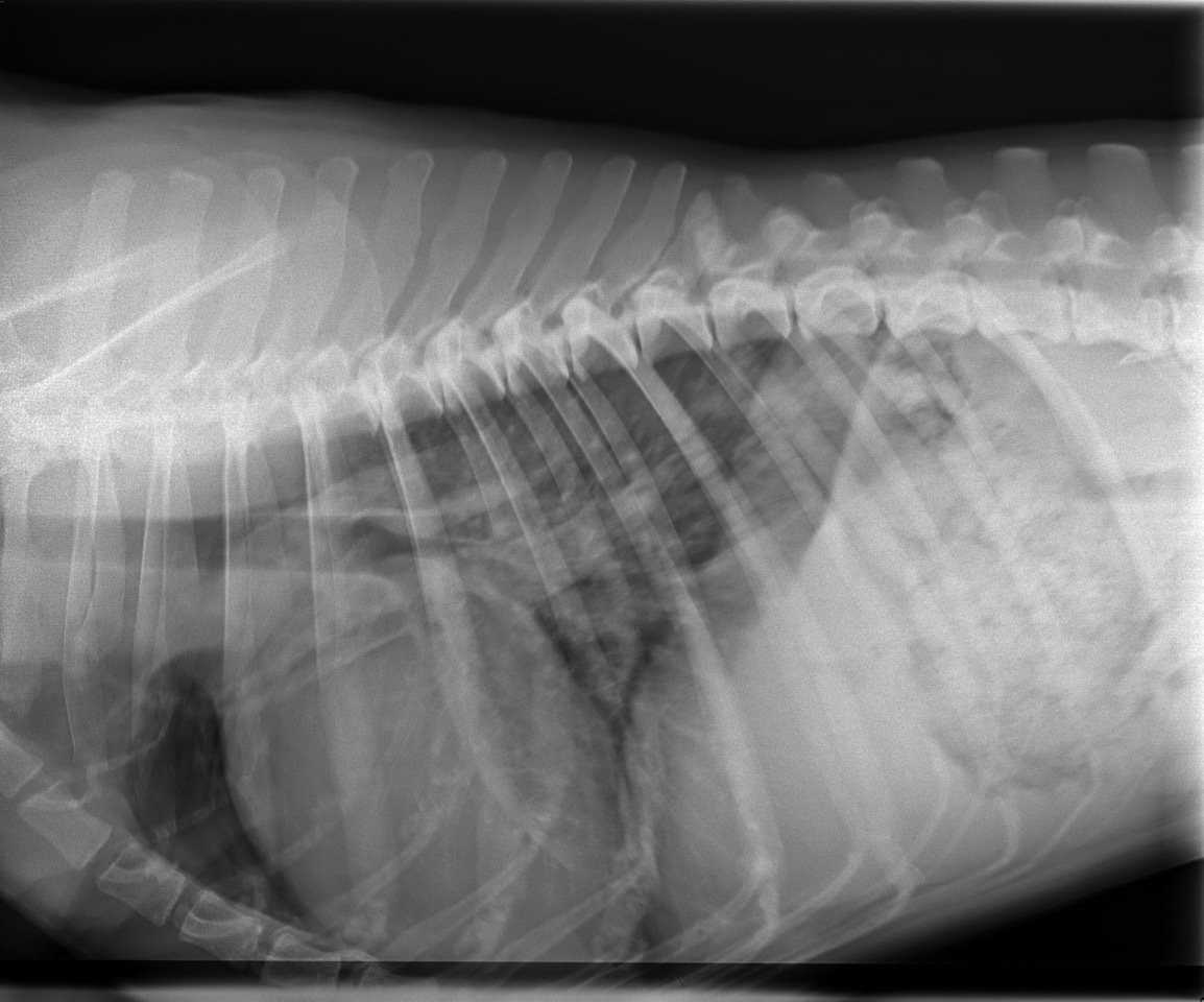Außerdem habe ich eine Röntgenaufnahme von Momos Brustkorb angefertigt. Diese zeigte dann auch eine Verschattung der hinteren Lungenlappen. Die Herzsilhouette war vergrößert und es war eine Stauung der Lungenvenen zu erkennen, was auf ein kardial bedingtes Lungenödem schließen lässt. Es befand sich also Wasser in Momos Lunge.
