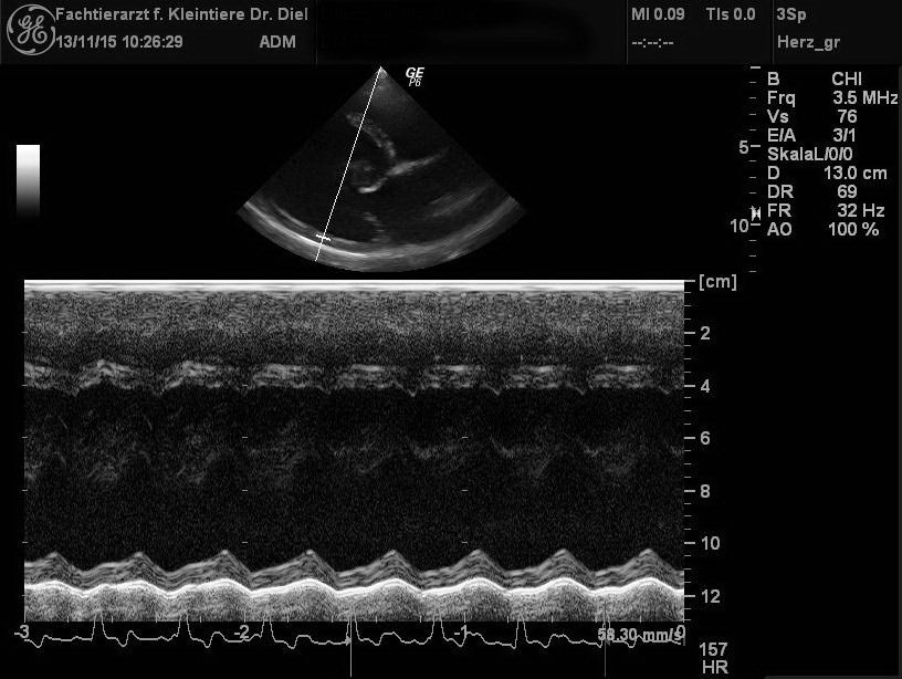 Ein Röntgenbild kann jedoch höchstens Hinweise auf Herzerkrankungen geben – allein genügt es nicht für eine sichere Diagnose. Ich habe daher das Herz noch einmal genauer mittels Ultraschall untersucht. Diese sogenannte Echokardiographie zeigte bei Momo eine deutlich vergrößerte linke Herzkammer mit sehr dünnen Herzwänden und einer stark verminderten Kontraktilität (die Herzkammer zieht sich also deutlich weniger stark zusammen als normalerweise). Daneben war auch der linke Vorhof vergrößert. Ich musste daher als Diagnose eine Dilatative Kardiomyopathie (DCM) feststellen.