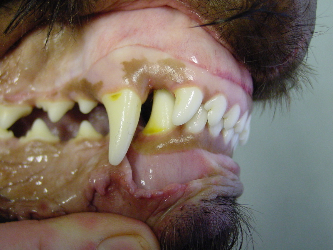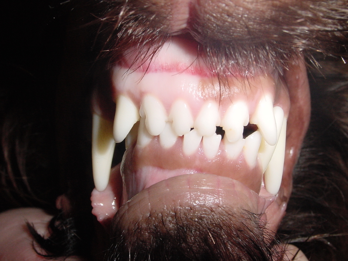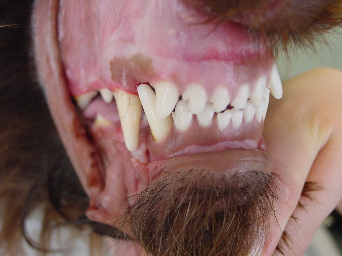 Als Finjas Besitzerin das erste Mal mit ihr in unsere Kieferorthopädie-Sprechstunde kam, war die Griffon-Hündin gerade 21 Monate alt. Sie erzählte uns, dass sie den Hund gerade erst neu gekauft habe und dass ihr der schiefe Kiefer (Bild 1) zuerst gar nicht aufgefallen sei. Als Finja aber bei der Apportierarbeit immer öfter Probleme zeigte, hatte sie genauer nachgeschaut und den Einbiss des Unterkiefereckzahnes in den Gaumen festgestellt (Bild 2).