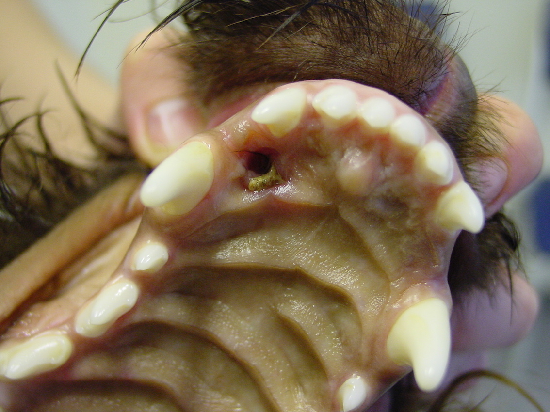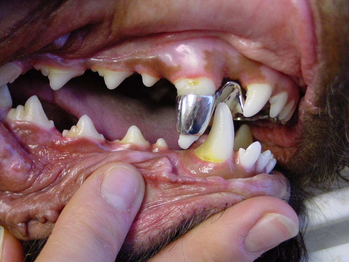 Bei der Allgemeinuntersuchung stellten wir keine Auffälligkeiten bei Finja fest. Jedoch zeigte sich bei der eingehenden Untersuchung der Gebisssituation ein sogenannter rechtsseitiger Caninuslingualstand Typ II mit Einbiss des rechten Unterkiefereckzahnes in den Gaumen und eine Schiefstellung des gesamten Unterkiefers. Bei genauerer Betrachtung der Einbissstelle konnten wir Haare und Futterpartikel aus dem Loch in der Gaumenschleimhaut entfernen (Bild 3). Bei der ausführlichen Beratung erklärten wir Finjas Besitzerin die Vor- und Nachteile der verschiedenen Therapiemöglichkeiten. Da die Hündin mit ihren 21 Monaten kieferorthopädisch gesehen im fortgeschrittenen Alter war, kam hier letztendlich nur eine Bisskorrektur infrage, mit einer aus Metall gegossenen Aufbeißschiene. Der Vorteil dieser im Dentallabor hergestellten Spange ist die Möglichkeit, diese über einen längeren Zeitraum von mehreren Monaten im Hundemaul zu belassen. Es besteht dabei kein Kontakt zur Maulschleimhaut. Bei der sonst üblichen Methode mit Kunststoffschienen, ist durch den permanenten Schleimhautkontakt und den damit verbundenen Zahnfleischreizungen nur ein begrenzter Verbleib von wenigen Wochen im Hundemaul möglich.