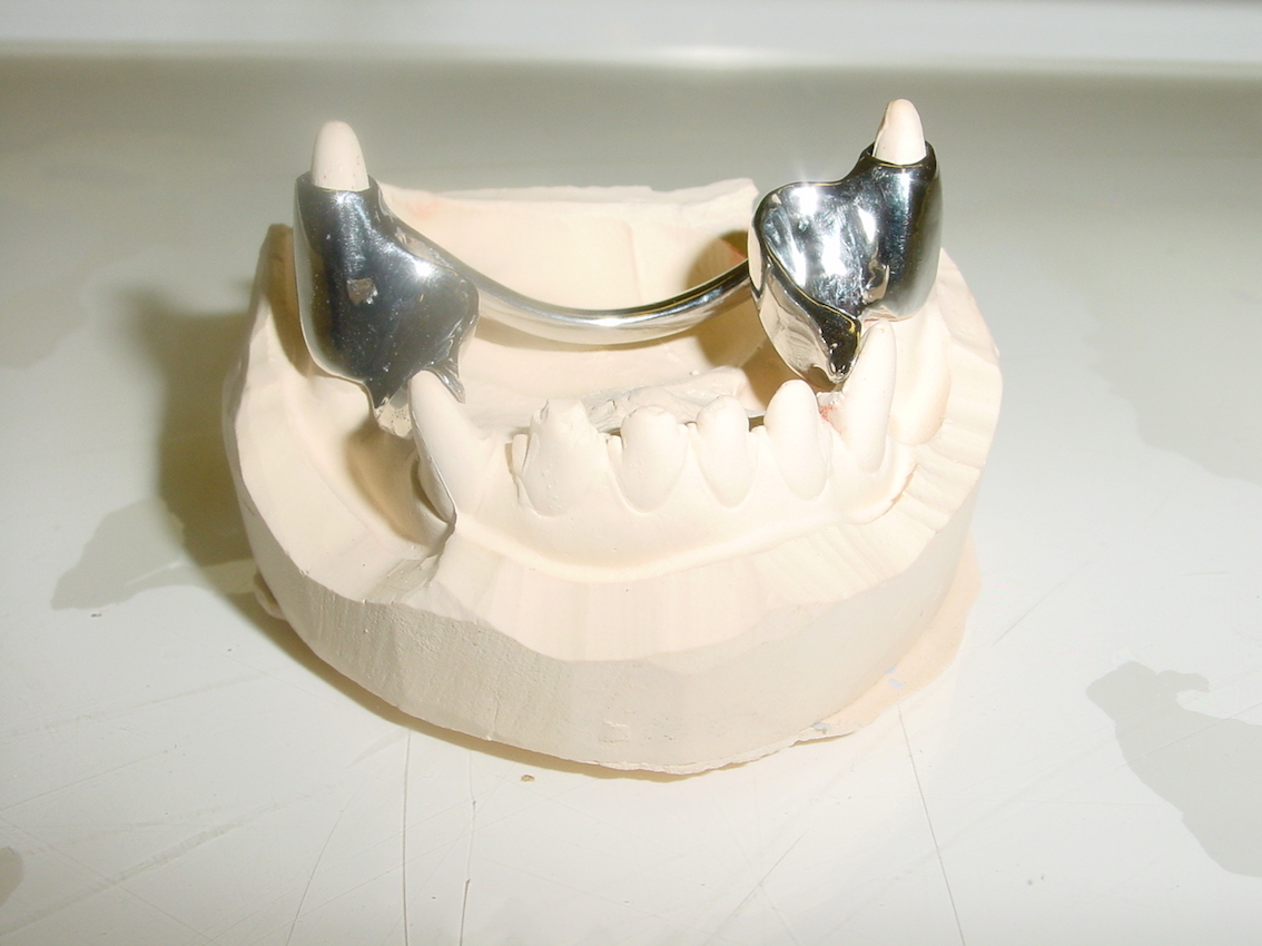 Bei der ersten Behandlung erstellten wir in Narkose mehrere Silikonabdrücke in Ober- und Unterkiefer, um mit Hilfe von Gipsmodellen die Bisssituation von Finja in einem Artikulator zu rekonstruieren. Auf Grundlage dieser Gipsmodelle wurde dann die Aufbeißschiene in einer Legierung aus Chromkobaltmolybdän im Gussverfahren hergestellt (Bild 4).