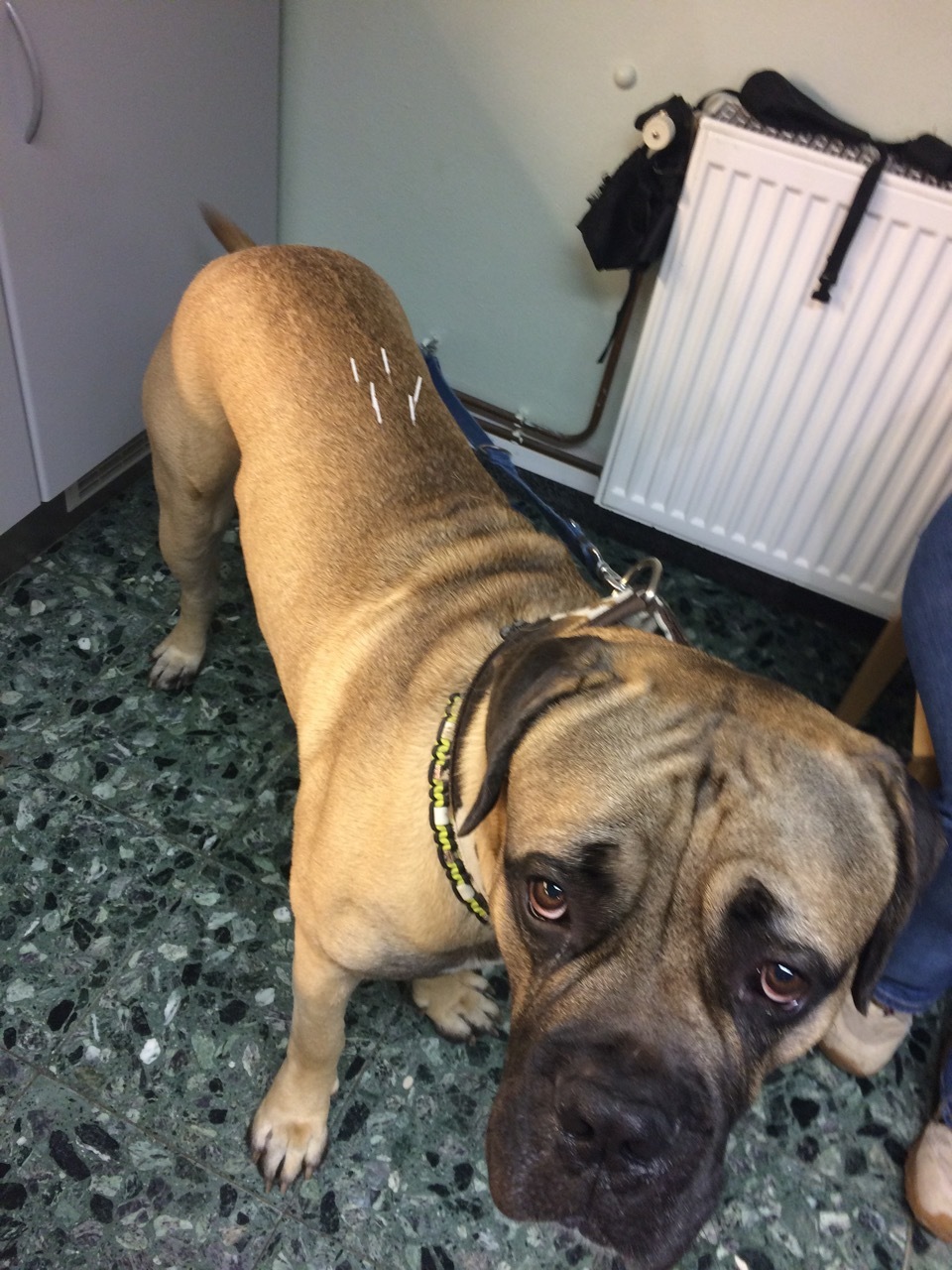 Buddy, einen eineinhalbjährigen männlichen Bullmastiff mit 57 Kilogramm, haben wir erst Ende September 2017 kennengelernt und sofort lieb gewonnen. Nach Besitzerwechseln und verschiedenen anderen Problemen ist der "Schoßhund" zum Glück bei seiner jetzigen Besitzerin gelandet, die sich mit dieser Rasse sehr gut auskennt. Deshalb ist ihr auch aufgefallen, dass Buddy an manchen Tagen ständig mit einem "Katzenbuckel" herumläuft und sich nicht gerne bewegen will. Beim Streicheln hat der gesamte Rückenbereich reflexartig gezuckt, der Hund ist sofort auf seinen Platz gegangen und wollte seine Ruhe haben.