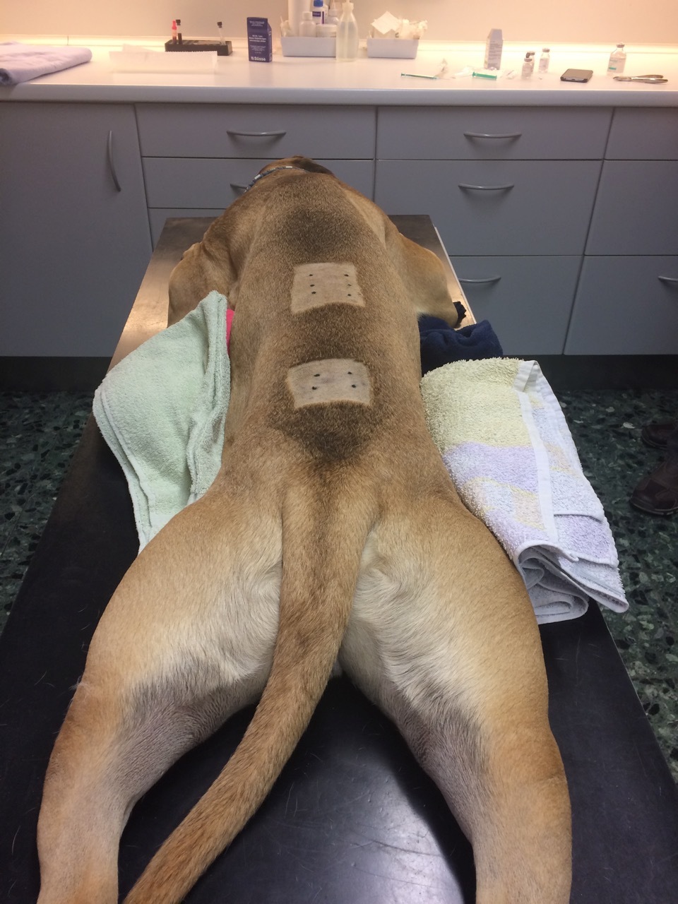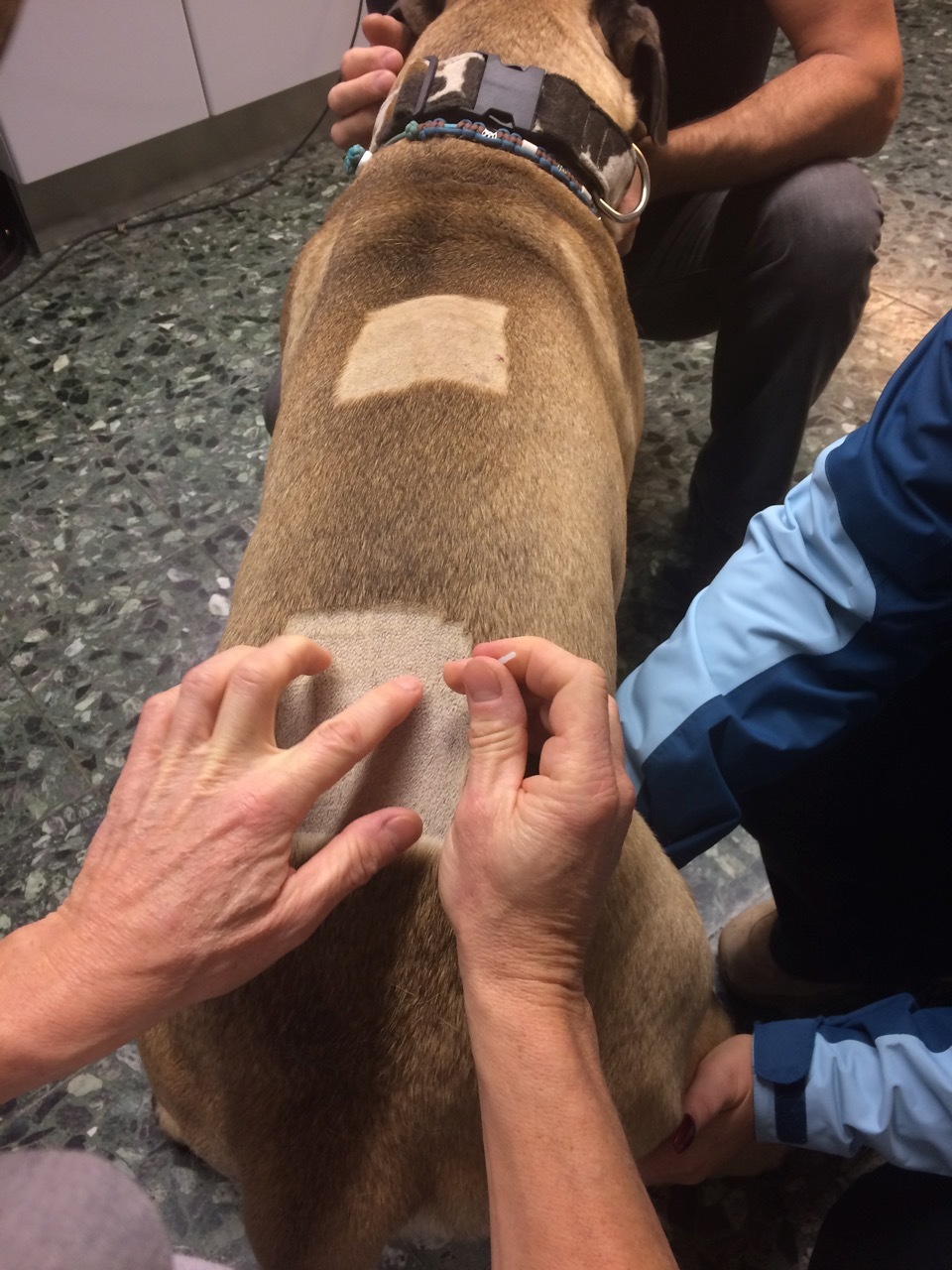 Anfang November war es dann soweit. Buddy benötigte auch noch ein HD-Röntgen, deshalb bekam er eine kurze Vollnarkose. Wir implantierten insgesamt 8 Goldstücke an den Puncta Maxima an seiner Wirbelsäule. Zur Bestätigung waren die Punkte so aktiv, dass sie auch in Narkose noch deutlich positiv reagierten. Nach genau einer Stunde erhob sich Buddy planmäßig und spazierte mit seiner Familie nach Hause. Die ersten Tage wurde uns berichtet, dass Buddy total gut aufgelegt und bei gutem Appetit war und ständig zum Spielen aufforderte. In den ersten Tagen machte er besonders stark einen Buckel, wodurch die Besitzerin etwas beunruhigt war.