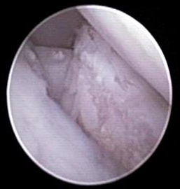 Somit stand die Diagnose „abgebrochener innerer Kronfortsatz“ (fragmentierter Processus coronoideus medialis ulnae) als Ursache für die Lahmheit bei „Oscar“ fest. Diese Erkrankung zählt zum Formenkreis der Ellbogengelenkdysplasie und ist eine der häufigsten Lahmheitsursachen der Vordergliedmaße beim großwüchsigen Hund. Da das Belassen des abgebrochenen Kronfortsatzes die Arthrosebildung begünstigt, haben wir in der gleichen Narkose das Bruchstück arthroskopisch entfernt.
