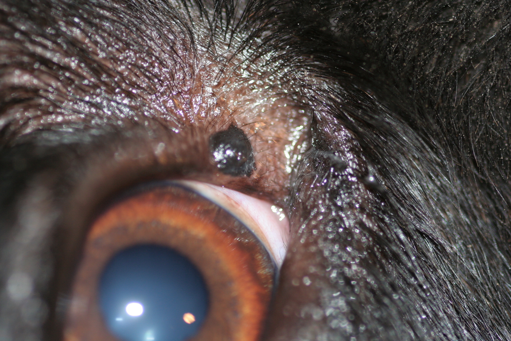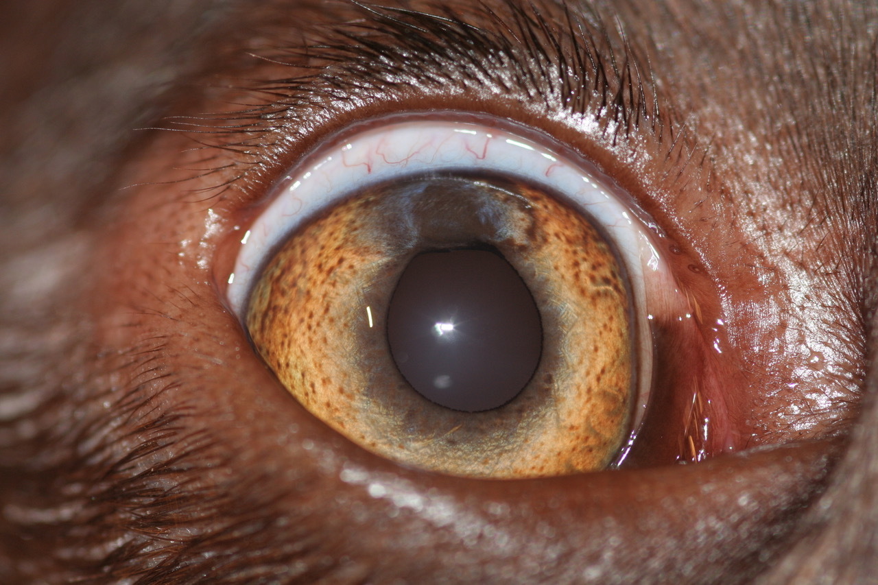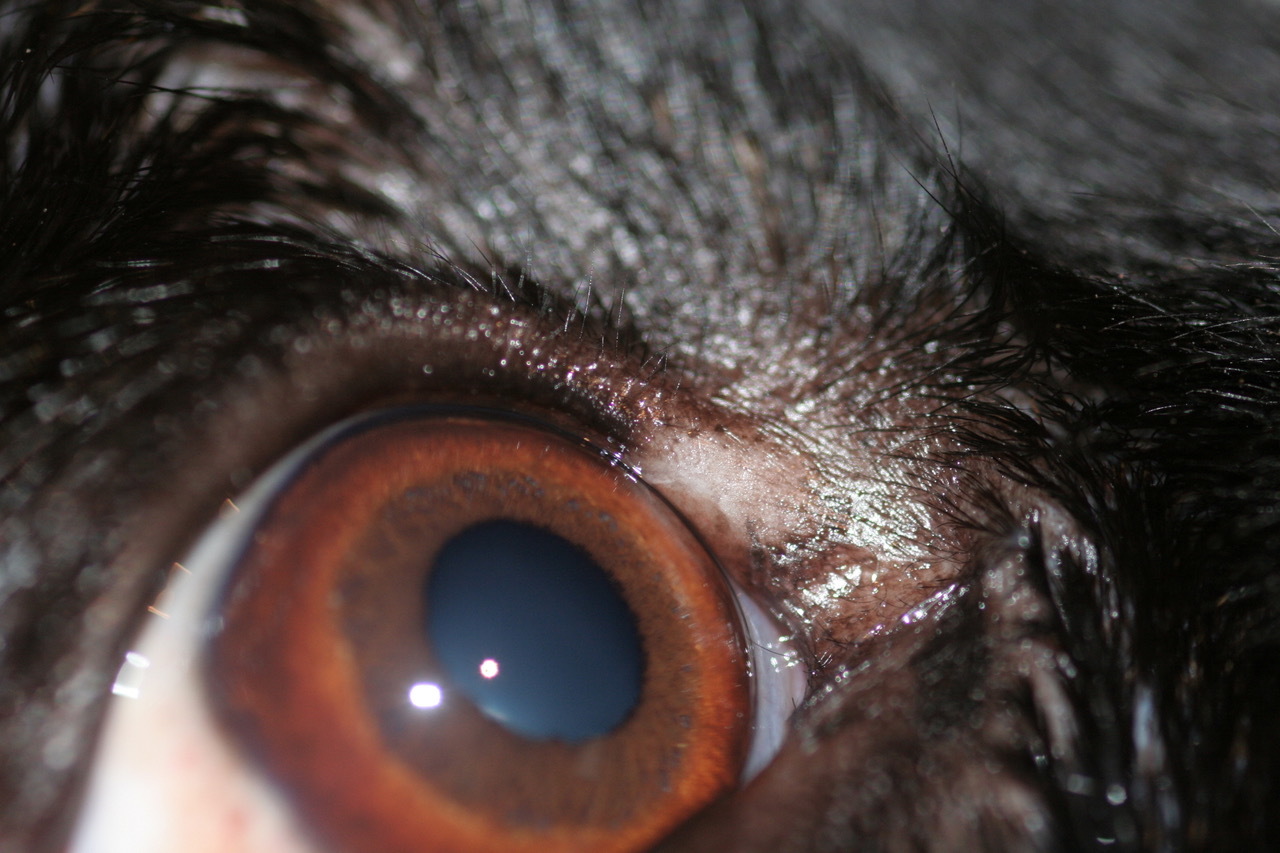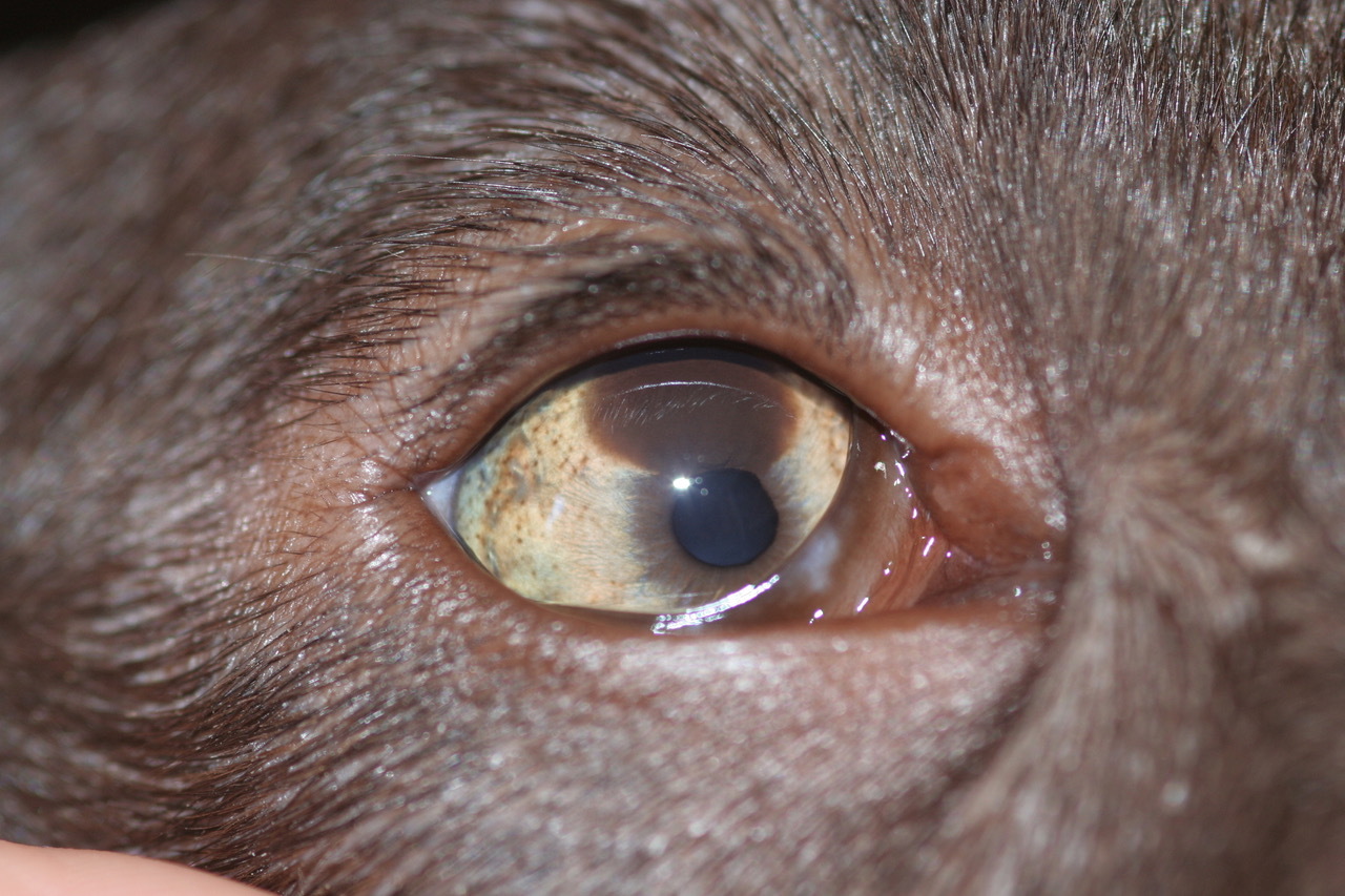 „Lilly“ ist ein zwölf Wochen alter, schokoladenfarbener Labrador Retriever Welpe. Den Besitzern fiel zwei Wochen vor der Vorstellung in unserer Praxis ein dunkler Fleck im linken Auge auf, der rasch an Größe zunahm. Bei uns zeigte sich eine flächige Pigmentierung von 11 bis 1 Uhr in der Iris. Diese wies eine leicht erhabene Oberfläche auf und reichte vom Rand der Pupille bis fast in den Kammerwinkel. Außerdem war die Pupille bereist leicht entrundet. Da ein typisches, klinisches Bild vorlag und Pigmentzelltumore bei dem genannten Farbschlag dieser Rasse gehäuft vorkommen, war Eile geboten. Nachdem weitere Voruntersuchungen (Untersuchung des Augenhintergrundes, Augenultraschall) keine neuen Befunde ergaben, wurde daher umgehend ein Operationstermin vereinbart.