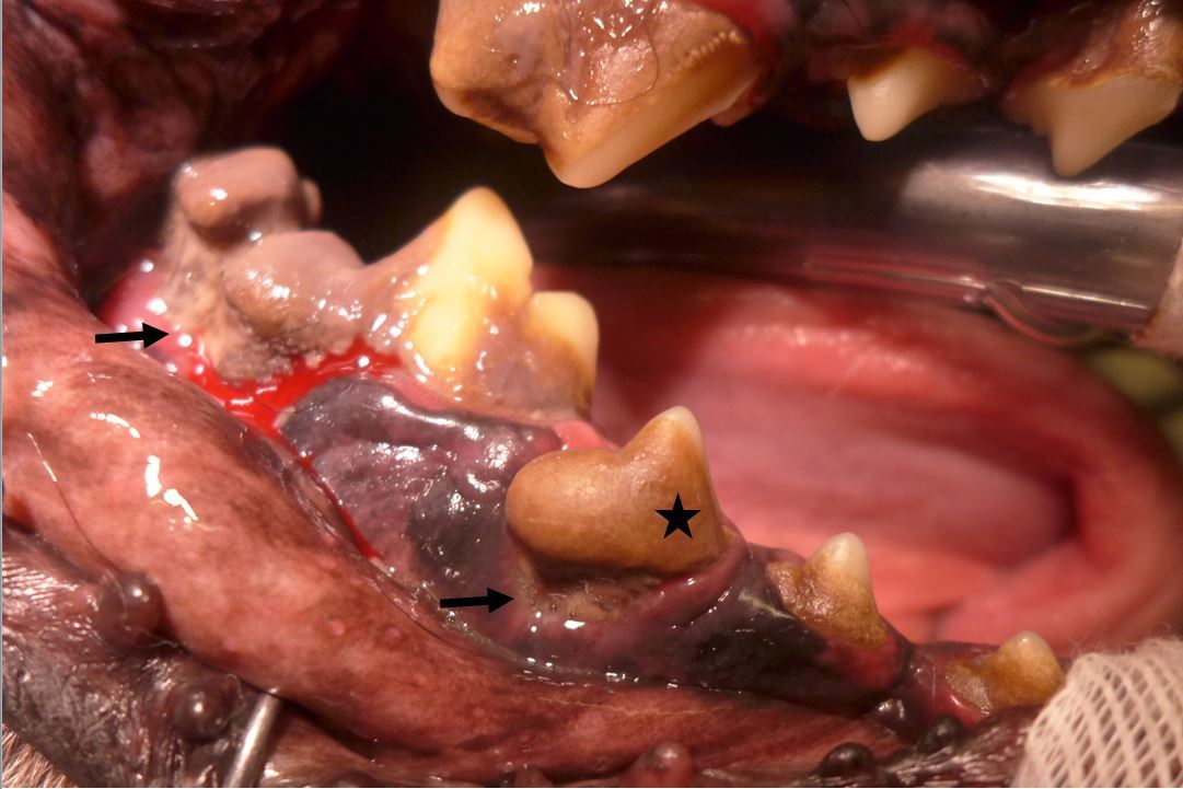 In unserer zahnmedizinischen Sprechstunde wurde eine 10-jährige, kastrierte Mischlingshündin vorgestellt, die seit zwei Tagen den Fang nicht mehr richtig öffnen und daher schlecht Futter aufnehmen konnte. Den Besitzern fällt schon seit längerem ein einseitiges Kauen - vermehrt linksseitig - und ein starker Geruch aus dem Maul auf. Zudem zeigte die Hündin Schmerzen beim Fressen.