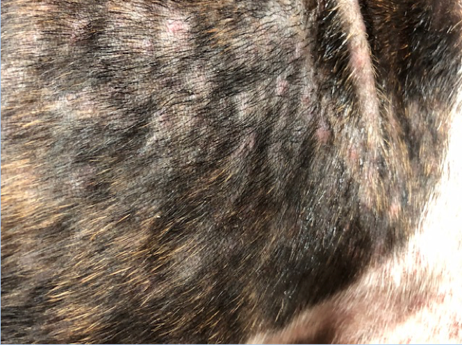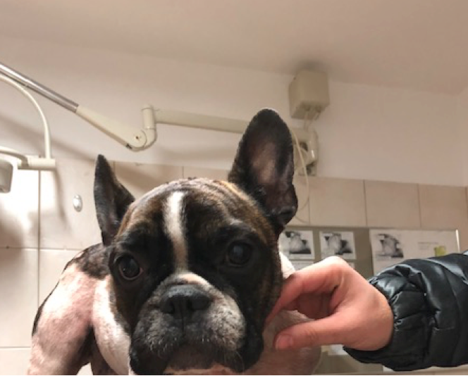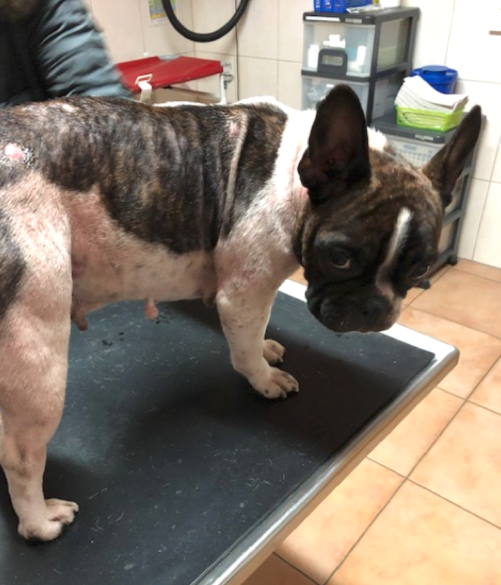 Das klinische Erscheinungsbild einer Milbenallergie ist vielfältig: Husten, Schnupfen, Durchfälle, Abgeschlagenheit, Hautsymptome - alles ist möglich. Am häufigsten kommt es zu quälendem Juckreiz, vor allem, wenn sowohl eine Futtermilben- als auch eine Hausstaubmilbenallergie vorliegt. Wie bei unserem Patienten „Babsi“, einer sympathischen Französischen Bulldogge, die seit zwei Jahren unter sehr starken Hautsymptomen mit starkem Fellverlust leidet. Nach ein paar Untersuchungen (Blutbild, Hautgeschabsel, Pilzkultur) steht fest: „Babsi“ leidet an einer starken allergischen Dermatitis (allergische Hautentzündung).