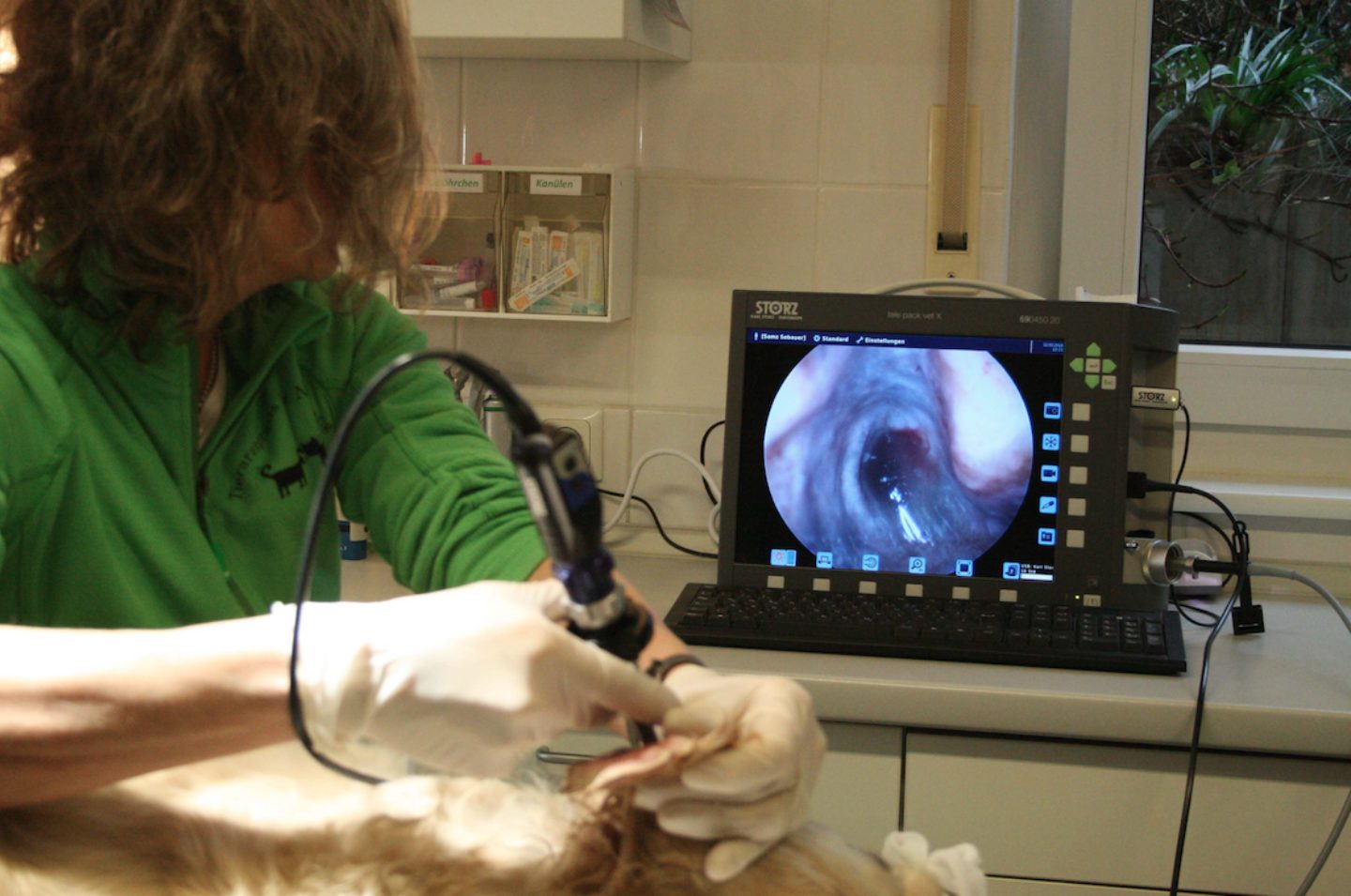 Sam, ein 8-jähriger Golden Retriever, leidet seit Jahren sehr unter seiner chronischen Ohrentzündung. Der Eiter läuft ihm quasi aus den Ohren. In diesem Fall hat sich die schwere Ohrentzündung auf das Mittelohr ausgebreitet. Da hilft nur noch eine Spülung von Gehörgang und Mittelohr in Vollnarkose durch den Tierarzt. Mit Hilfe eines Videoendoskops wird der Ohrkanal mit einer starken Lichtquelle unter Vergrößerung auf einen Bildschirm übertragen und untersucht. Tiefe Ohrregionen und das Mittelohr können so von zähem Sekret und Eiter mit einer an das Gerät gekoppelten Spülvorrichtung befreit werden. Auch Medikamente können über eine Vorrichtung in tiefe Ohrregionen verabreicht werden. Die Ausrüstung steht wenigen, spezialisierten Praxen zur Verfügung.