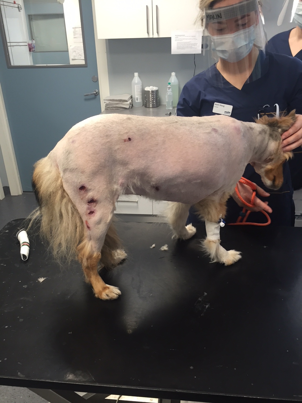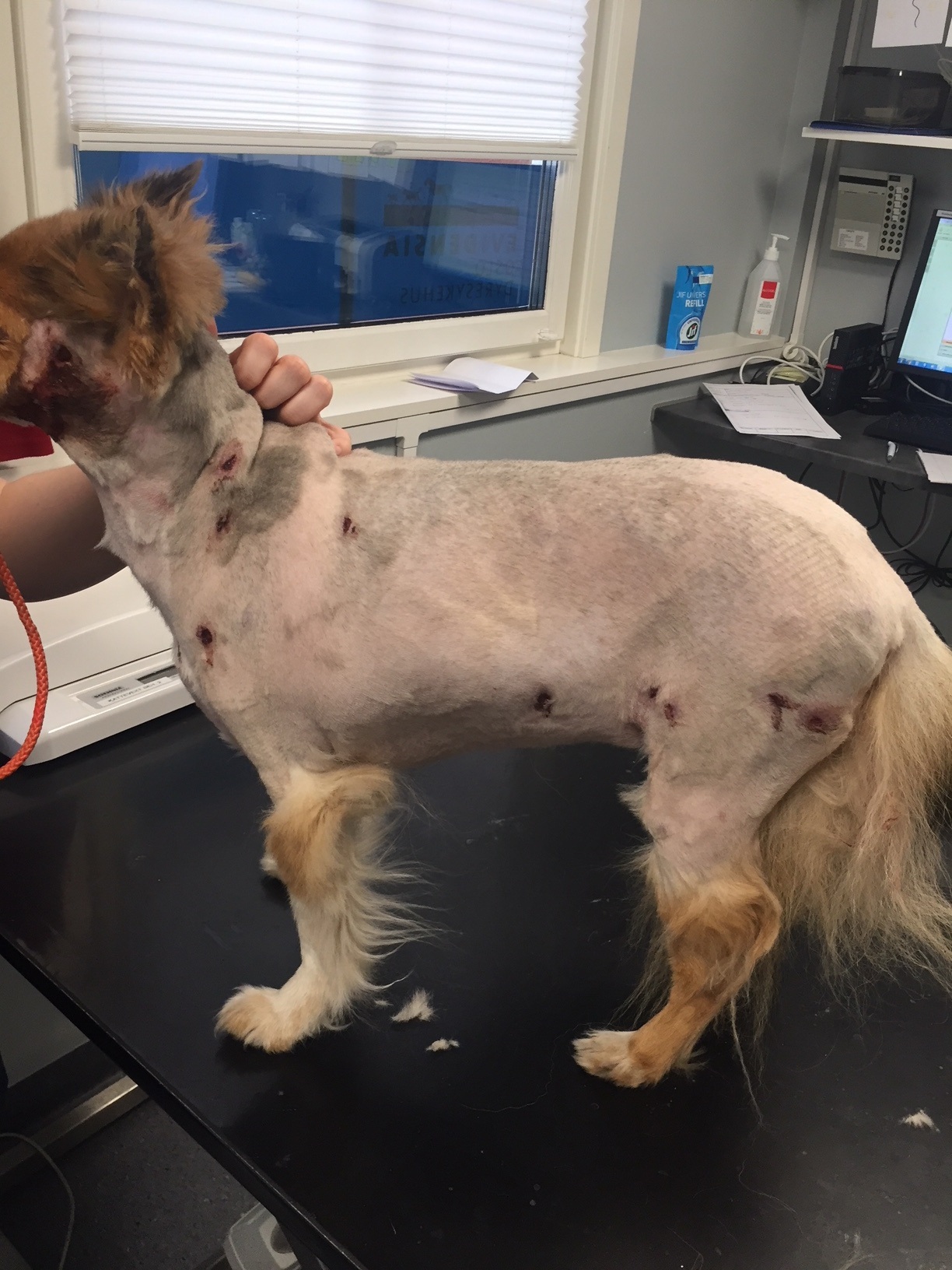 Nach sechs Tagen kam Ziva zur Kontrolle erneut zu ihrem Haustierarzt. Ihr Zustand hatte sich drastisch verschlechtert. Der gespaltene Abszess am Kopf wollte nicht verheilen, sie hatte nun deutliches Fieber über 40° entwickelt, war müde und schlapp, fraß sehr wenig und wirkte sehr deprimiert. Bei näherer Untersuchung wurde eine Vielzahl von Abszessen verteilt über Zivas ganzen Körper gefunden - der offenbar unschuldig verurteilte Partnerhund war damit aus dem Schneider - er konnte nicht der Übeltäter sein. Im dichten Fell der Shetland Sheepdog Hündin waren die Abszesse der Besitzerin gar nicht aufgefallen.