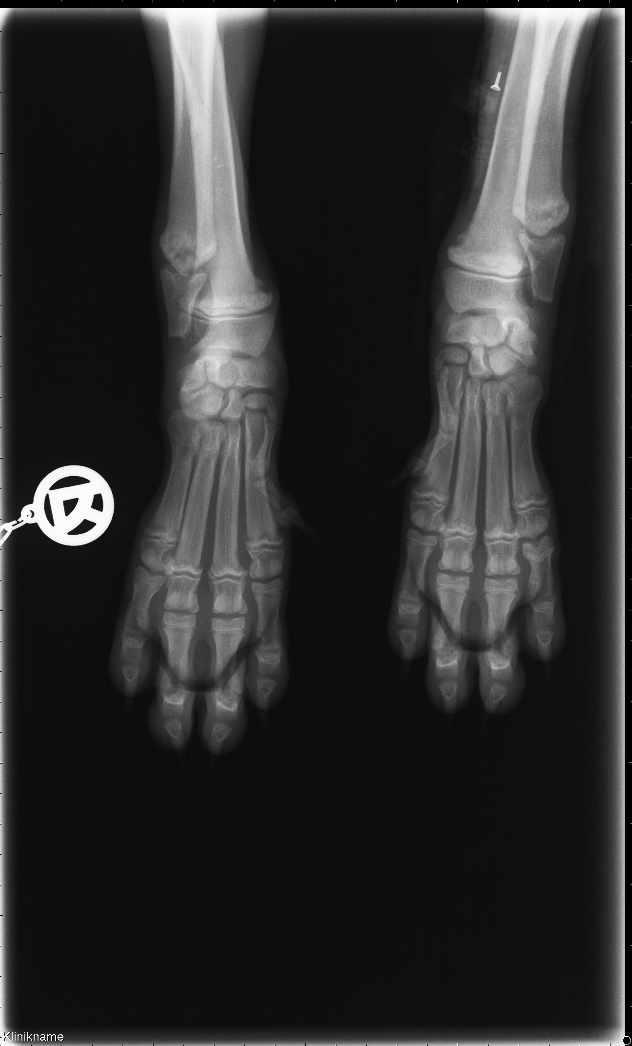 Da die Wachstumsfugen im distalen Antebrachium (Höhe der Handwurzelgelenke) schon äußerlich sichtbar stark verdickt waren, wurde die Gunst der Stunde genutzt und Röntgenaufnahmen ohne Narkose angefertigt. Das Ergebnis war für Elliot eine Überraschung, aber eigentlich eine wenn auch sehr seltene rassetypische Erkrankung des wachsenden Knochens.