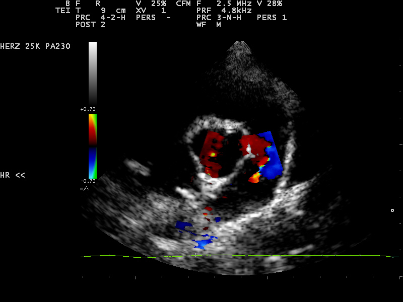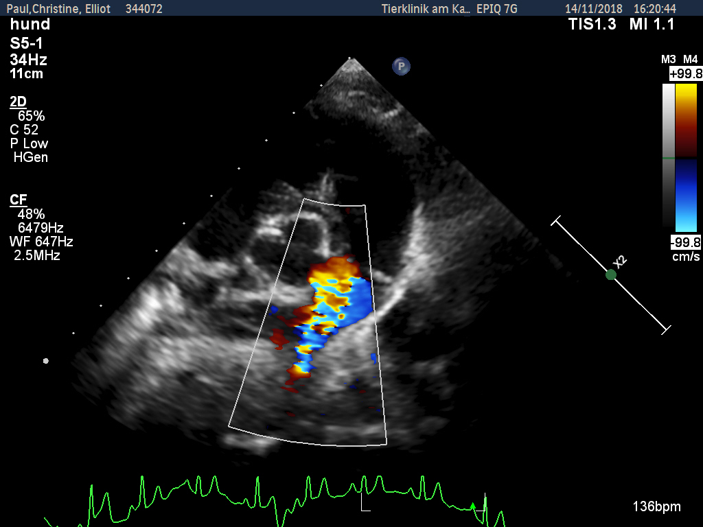 Zunächst wurde von den Kollegen - aufgrund des zeitlichen Zusammenhangs - eine Impfreaktion vermutet, woraufhin Elliot starke Schmerzmittel bekam. Allerdings besserte sich seine Lahmheit weder durch Schmerzmittel noch durch Kortison wesentlich. Da man äußerlich nichts feststellen konnte, wurde eine erste Röntgenuntersuchung des Rumpfes durchgeführt, bei der aber die Ursache leider nicht gefunden wurde. Als auch nach dieser weder Fieber noch Lahmheit verschwanden, wurde der Hund zur Spezialdiagnostik überwiesen. Es sollte nun bei uns in der Klinik erneut geröntgt und eventuell eine Computertomographie durchgeführt werden. Bei der Eingangsuntersuchung vor der notwendigen Narkose wurde ein kontinuierliches Herzgeräusch festgestellt. Dieses konnte nur unter dem linken Schulterblatt in Höhe des 2.-3. Zwischenrippenraumes auskultiert werden. An dieser Stelle war es aber sehr laut (Grad 5 von 6) und gut hörbar. Der untersuchende Kardiologe stellte einen klinisch relevanten PDA (Ductus arteriosus botalli persistens) fest, der sich schon in einem behandlungswürdigen Stadium befand. Daher war an eine Narkose zur Abklärung der Lahmheit an diesem Tage nicht zu denken.