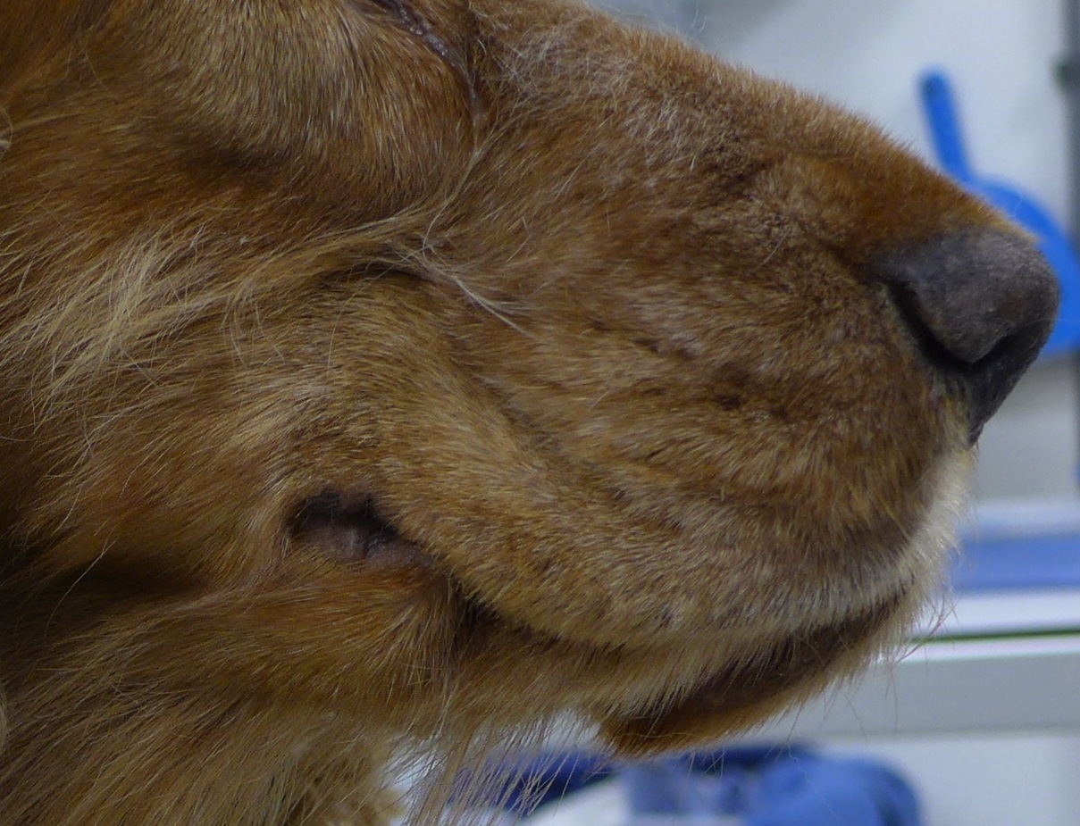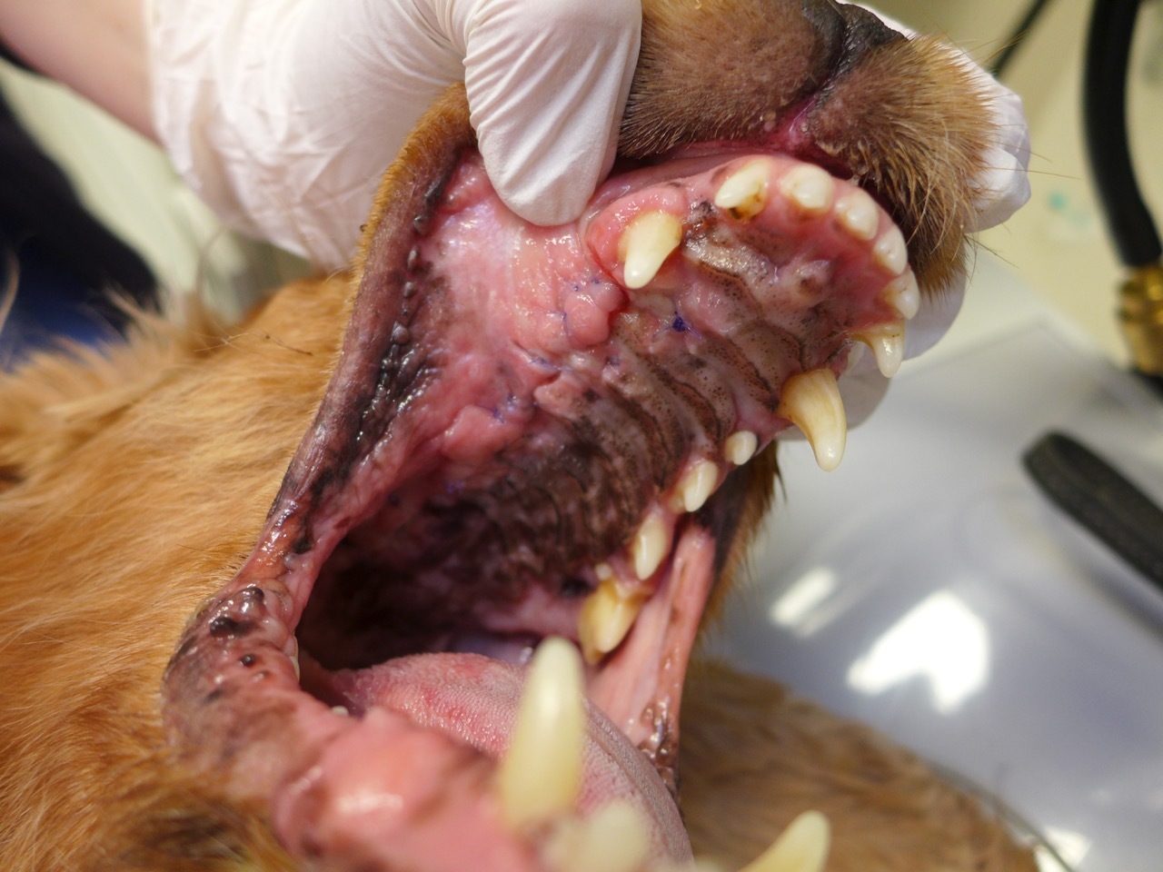 Timos Besitzern war im Herbst letzten Jahres erstmals eitriger Nasenausfluss bei Ihrem elfjährigen Cocker-Spaniel-Rüden aufgefallen. Eine Behandlung mit einem Antibiotikum brachte nur kurzfristig Besserung. Kurze Zeit später bemerkten sie außerdem eine Umfangsvermehrung am rechten Oberkiefer. Ihr Tierarzt vermutete eine entzündete Zahnwurzel, und Timo wurde daraufhin einer Zahnsanierung unterzogen. Der betroffene Backenzahn wurde gezogen und eine kleine Gewebeprobe aus dem veränderten Bereich entnommen und zum Pathologen geschickt. Die eingeleitete patho-histologische Untersuchung ergab dann den Verdacht eines entzündlich überlagerten Plattenepithelkarzinoms des Zahnfleisches.