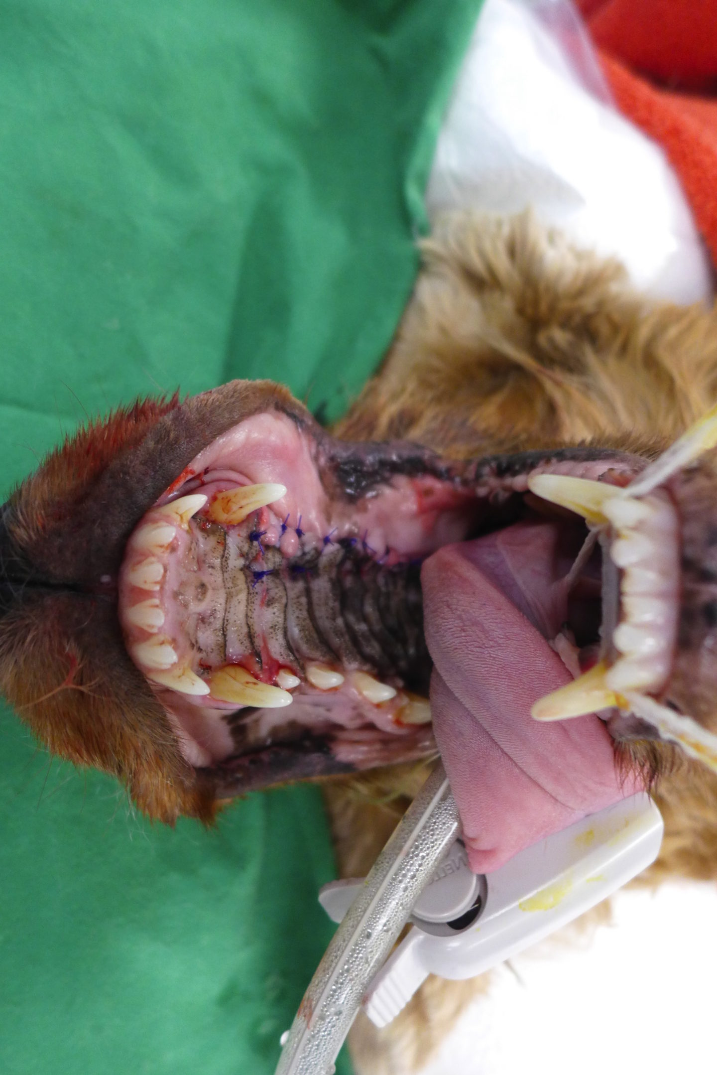 Aufgrund des invasiven Wachstums ist ein oberflächliches Abtragen des Tumors leider nicht erfolgsversprechend, und es kommt schnell zu einem Wiederauftreten des Tumors. Die Therapie der Wahl stellt daher eine Kieferresektion dar. Hierbei wird der Tumor, sowie der veränderte Kieferknochen großzügig entfernt. Wenn damit eine komplette Entfernung des Plattenepithelkarzinoms erreicht werden kann, ist die Prognose günstig und es kann in vielen Fällen sogar von einer Heilung ausgegangen werden. Alternativ besteht auch die Möglichkeit einer Strahlentherapie, da die Plattenepithelkarzinome der Maul-Schleimhaut gut auf eine Bestrahlung ansprechen. Auch hiermit kann eine lange Überlebenszeit erreicht werden. Gerade bei inoperablen Tumoren ist dies eine gute Option. Timos Besitzer haben sich nach reiflicher Überlegung und Besprechung im Familienkreis zu einer Kieferresektion entschieden. Hunde tolerieren eine solche in der Regel sehr gut und können nach Abschluss der Wundheilung ein ganz normales Leben - auch mit Kaustangen und Kauspielzeug - führen.