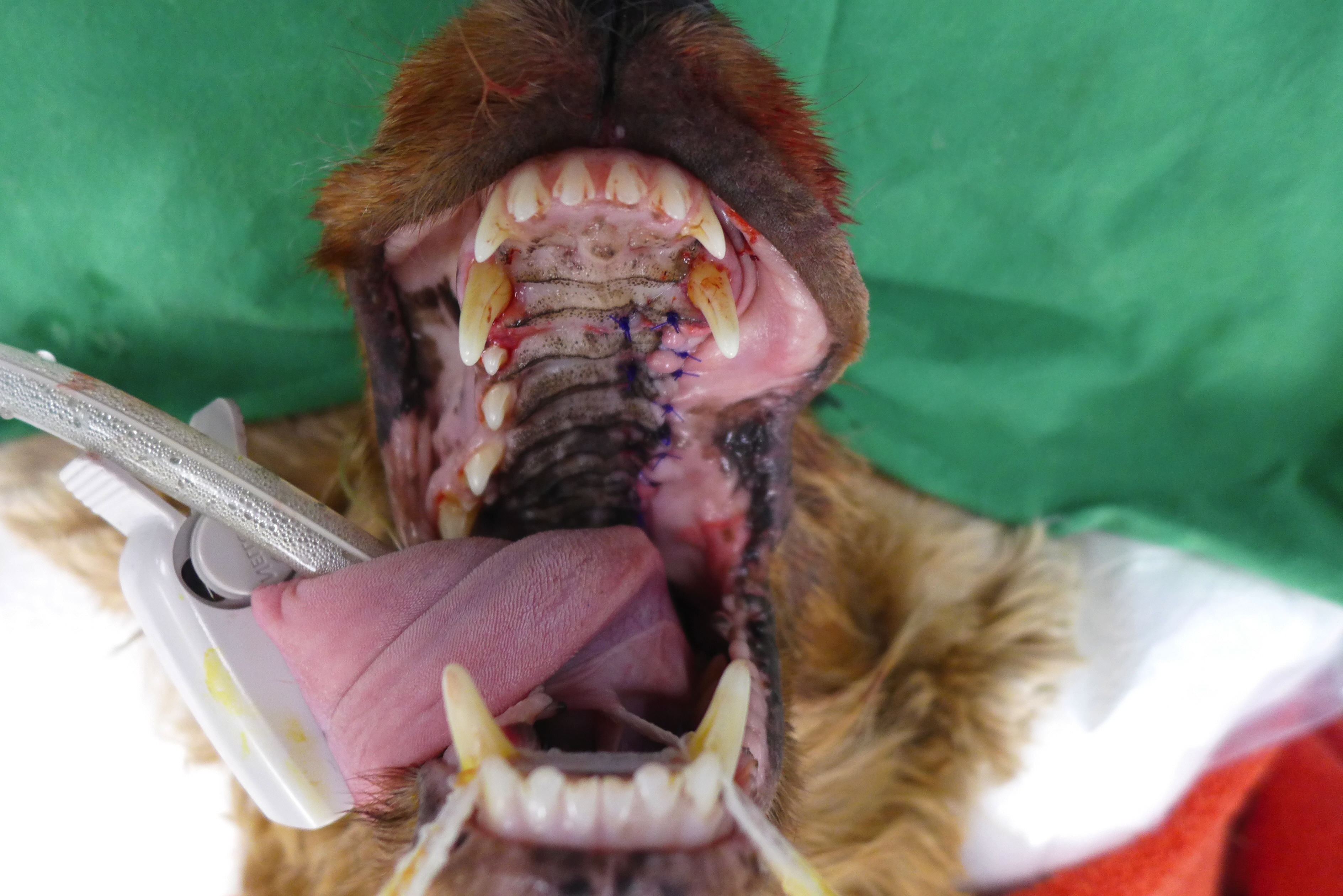 Timo wurde einige Tage später bei uns operiert - der betroffene Kieferknochen inkl. Sicherheitsabstand wurden entfernt. Bereits am Tag nach der Operation wurde der Patient mit Futter in Hackbällchen-Konsistenz angefüttert. Die erste Kontrolle der Nähte war äußerst zufriedenstellend, und Timo konnte so drei Tage nach der Operation bereits wieder entlassen werden. Die Wundheilung schritt schnell voran und auch der eitrige Nasenausfluss ist komplett abgeklungen. Wir wie auch Timos Besitzer waren mit dem Verlauf der Heilung sehr zufrieden. Auch optisch fällt nicht auf, dass ihm ein Stück Oberkiefer fehlt.