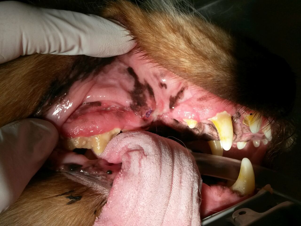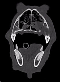 Für eine ausführliche Untersuchung der Maulhöhle sowie eine Computertomographie (CT) wurde Timo anschließend kurz in Narkose gelegt. Im CT konnte man eine mottenfraßartige Auflösung des Kieferknochens im Bereich der etwa 2,5 cm großen Umfangsvermehrung sowie eine Verbindung zwischen der Schleimhaut der Maulhöhle und der rechten Nasenhöhle erkennen. Die regionären Lymphknoten waren etwas vergrößert. Der Brustkorb sowie das Lungengewebe stellten sich unauffällig dar. Das radiologische Bild der aggressiven Knochenläsion im rechten Oberkiefer mit begleitender Weichteilraumforderung war mit dem vermuteten Plattenepithelkarzinom in Einklang zu bringen.