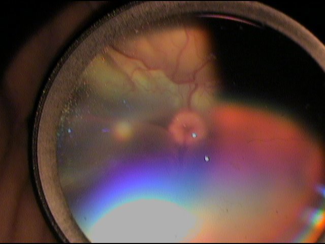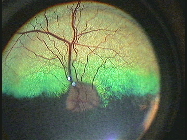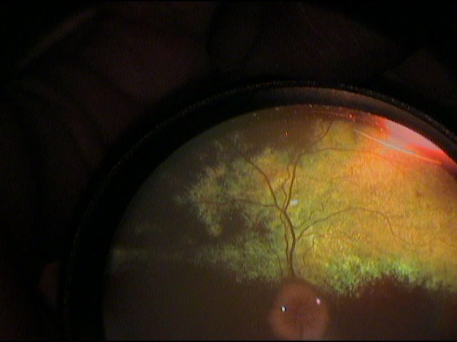Bei der Untersuchung des Augenhintergrunds zeigte sich die Netzhaut wieder auf beiden Augen angelegt. Allerdings fanden sich schon jetzt im Bereich des Augenhintergrunds heller reflektierende Bereiche und eine vermehrte Einsprossung von schwarzem Pigment in den eigentlich grünlichen Bereich der Netzhaut (Tapetum lucidum). Dies sind Zeichen von zugrunde gehenden Netzhautzellen. Dieser Zustand der Netzhaut-Degeneration stellt sich schon nach wenigen Stunden der Netzhautablösung ein und ist nicht rückgängig zu machen, wenn die Netzhaut wieder angelegt ist.