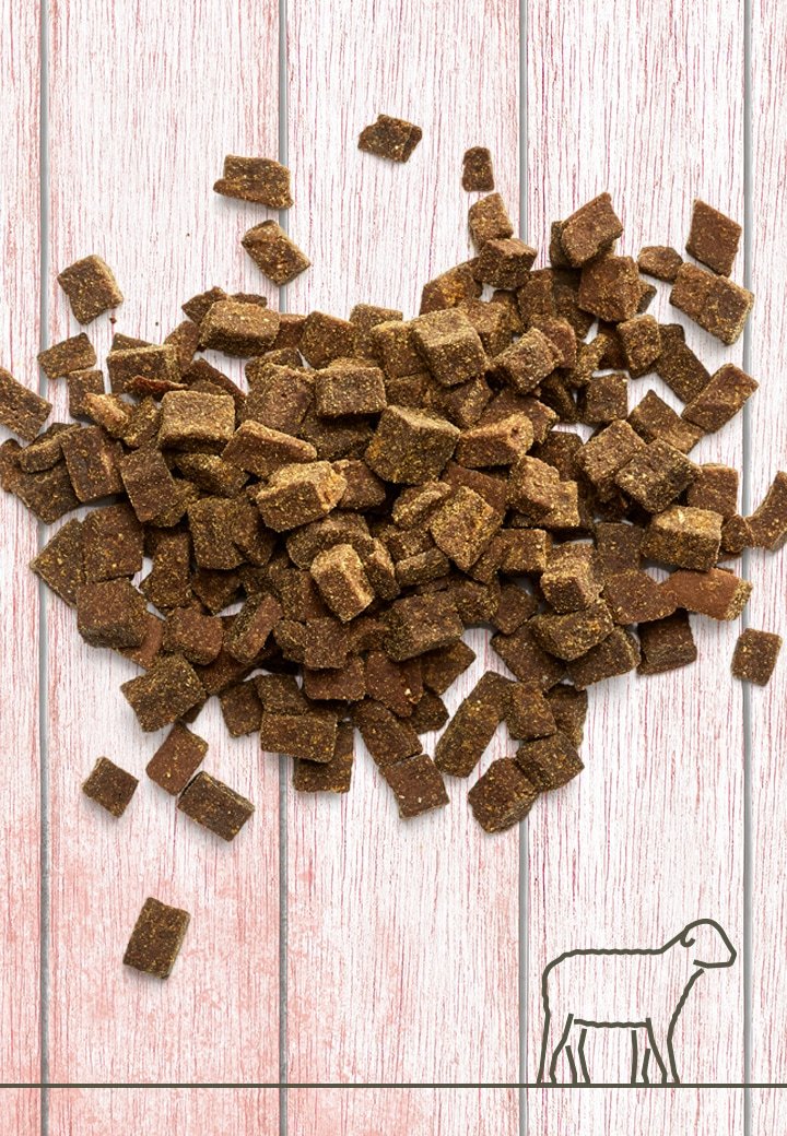 10 Lammfleisch-Leckerchen (reines Fleisch, ca. 112 kj) decken 1,6% des Tagesbedarfs des Welpen