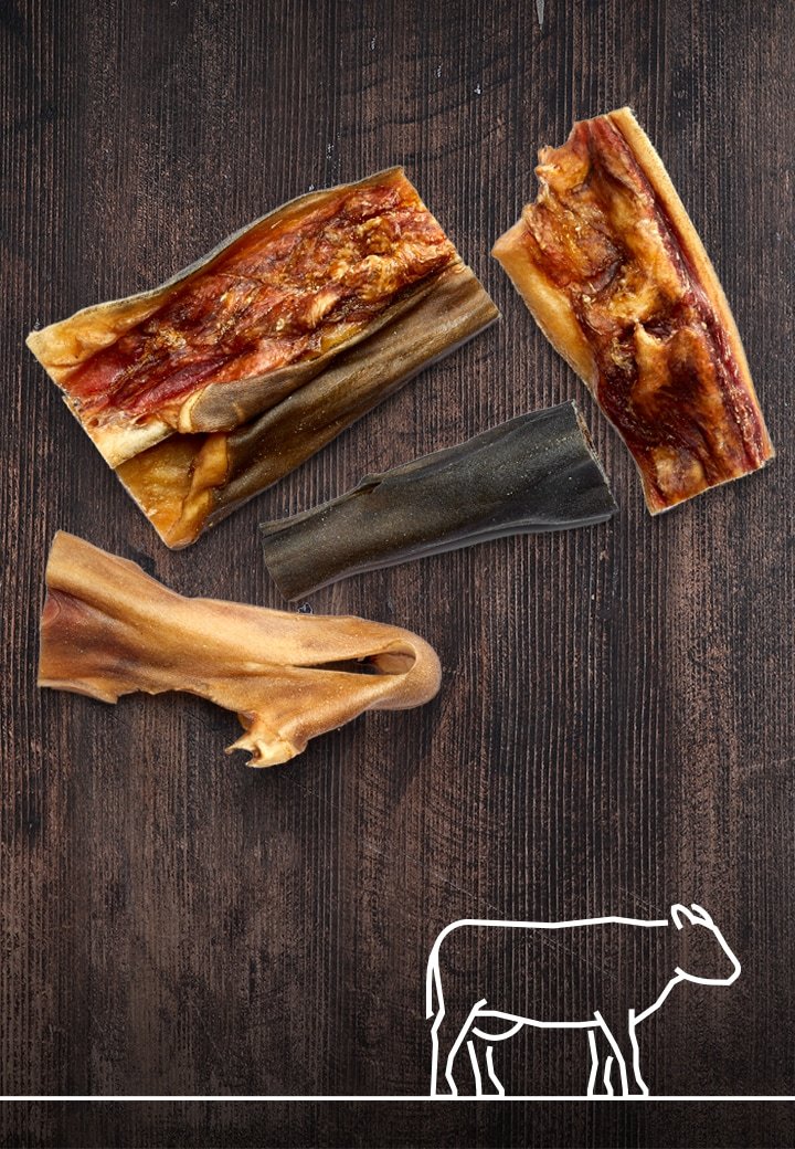 1 Rinderohr (ohne Muschel, ca. 20 g, 313 kj) deckt 4,5% des Tagesbedarfs des Welpen