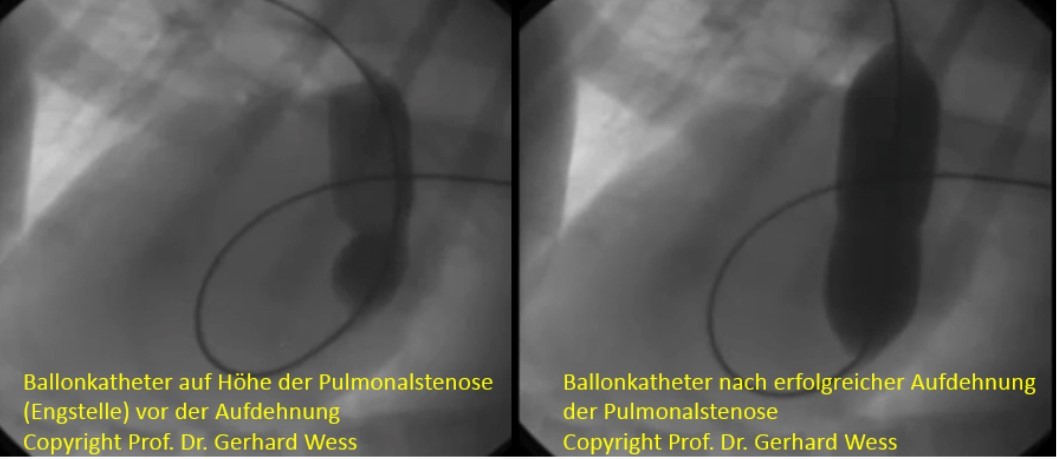 Die Ballonvalvuloplastie stellt einen minimal invasiven Herzkathetereingriff mit großen Erfolgsaussichten dar, wobei post OP nur eine winzige Hautnaht am Hals zu sehen ist. In Vollnarkose wird dabei ein Herzkatheter über die rechte Halsvene in den rechten Vorhof und die rechte Hauptkammer des Herzens und anschließend in die Pulmonalarterie geführt. Anschließend wird der Ballon mit einem Kontrastmedium gefüllt und die Stenose behoben. Komplikationen sind selten.“