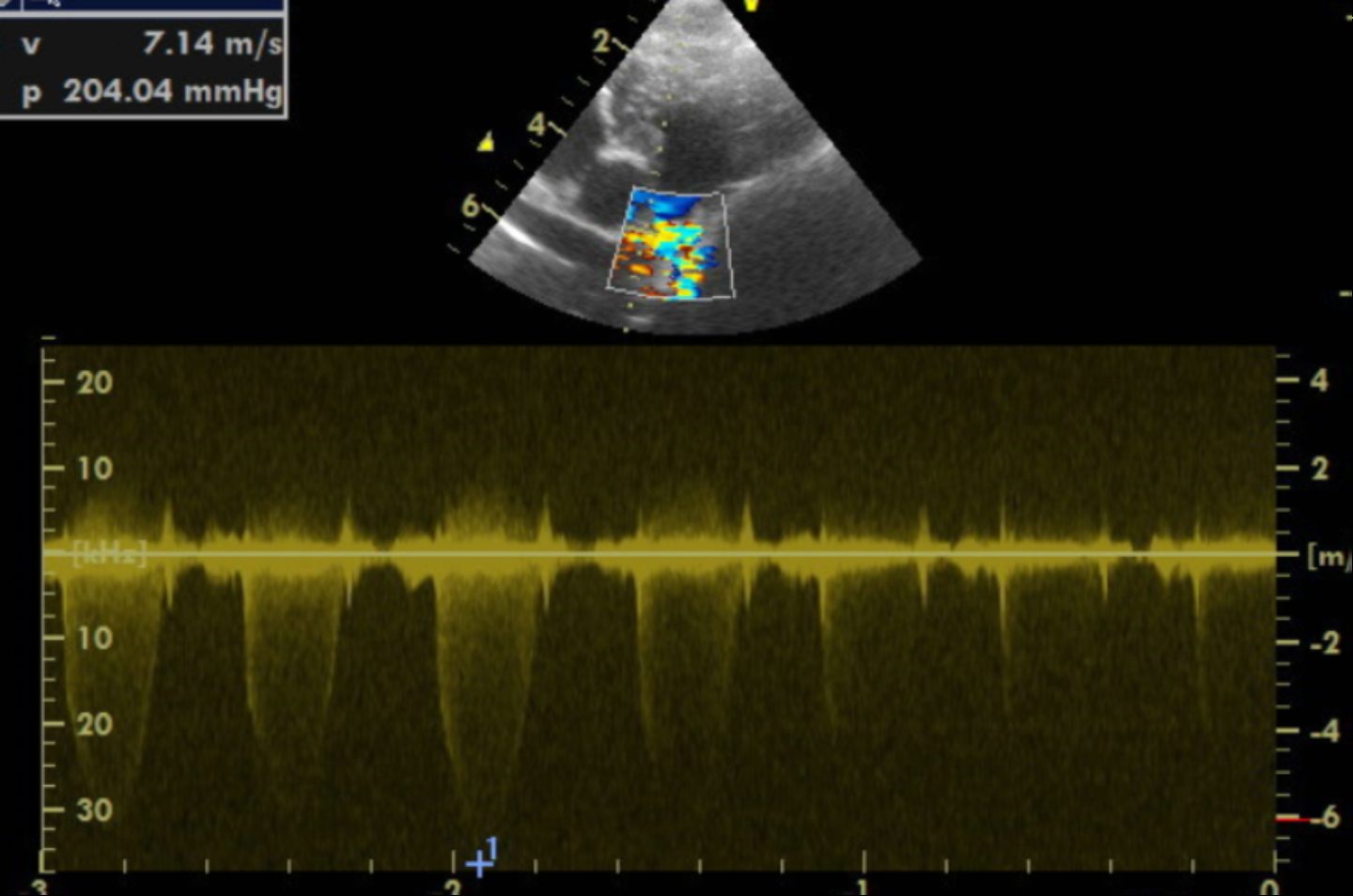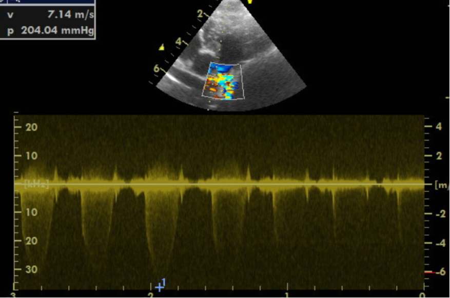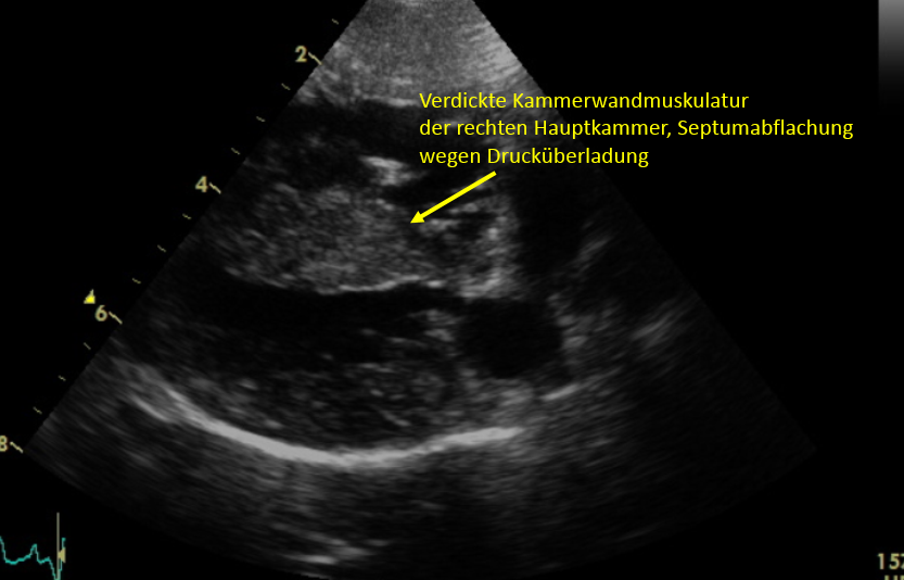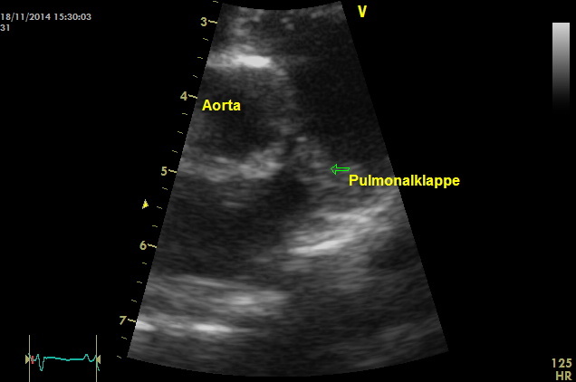 Im Herzultraschall zeigte sich eine hochgradig verdickte Muskulatur der Kammerwände der rechten Hauptkammer aufgrund einer hochgradigen Druckerhöhung. Es offenbarten sich außerdem angeborene Veränderungen der Mitralklappen und der Trikuspidalklappen. Bei der Darstellung der Pulmonalarterie zeigte sich eine missgebildete Pulmonalklappe, die wenig beweglich war. Zudem schloss und öffnete sie sich nicht vollständig. Die hochgradige Verwachsung der Pulmonalklappenöffnung führte zu einem sehr starken Anstieg des Blutdrucks von normalerweise 20 mmHg (Millimeter Quecksilbersäule) auf über 200 in der rechten Hauptkammer. Außerdem war der Klappenring der Pulmonalarterie sehr eng angelegt, wodurch der Schweregrad zusätzlich negativ beeinflusst wurde.