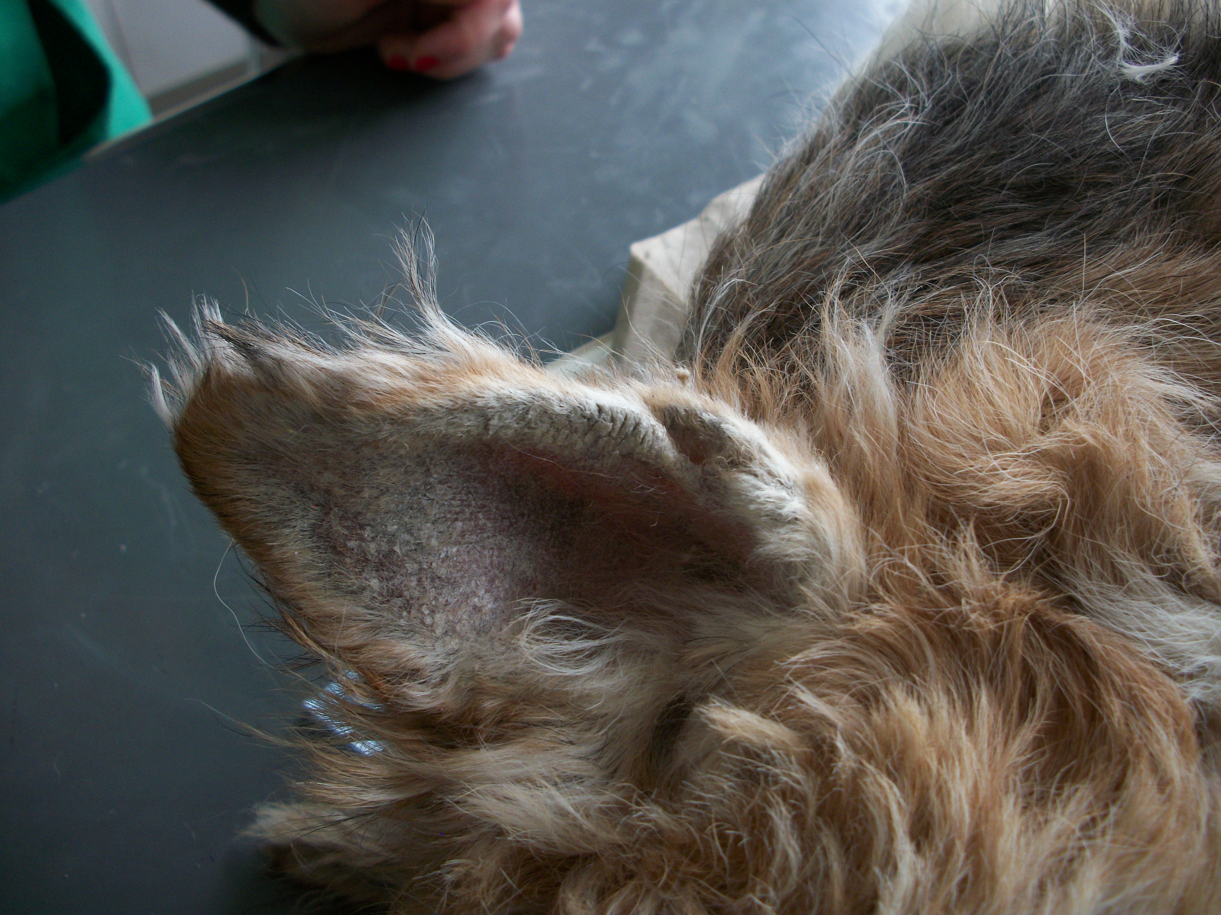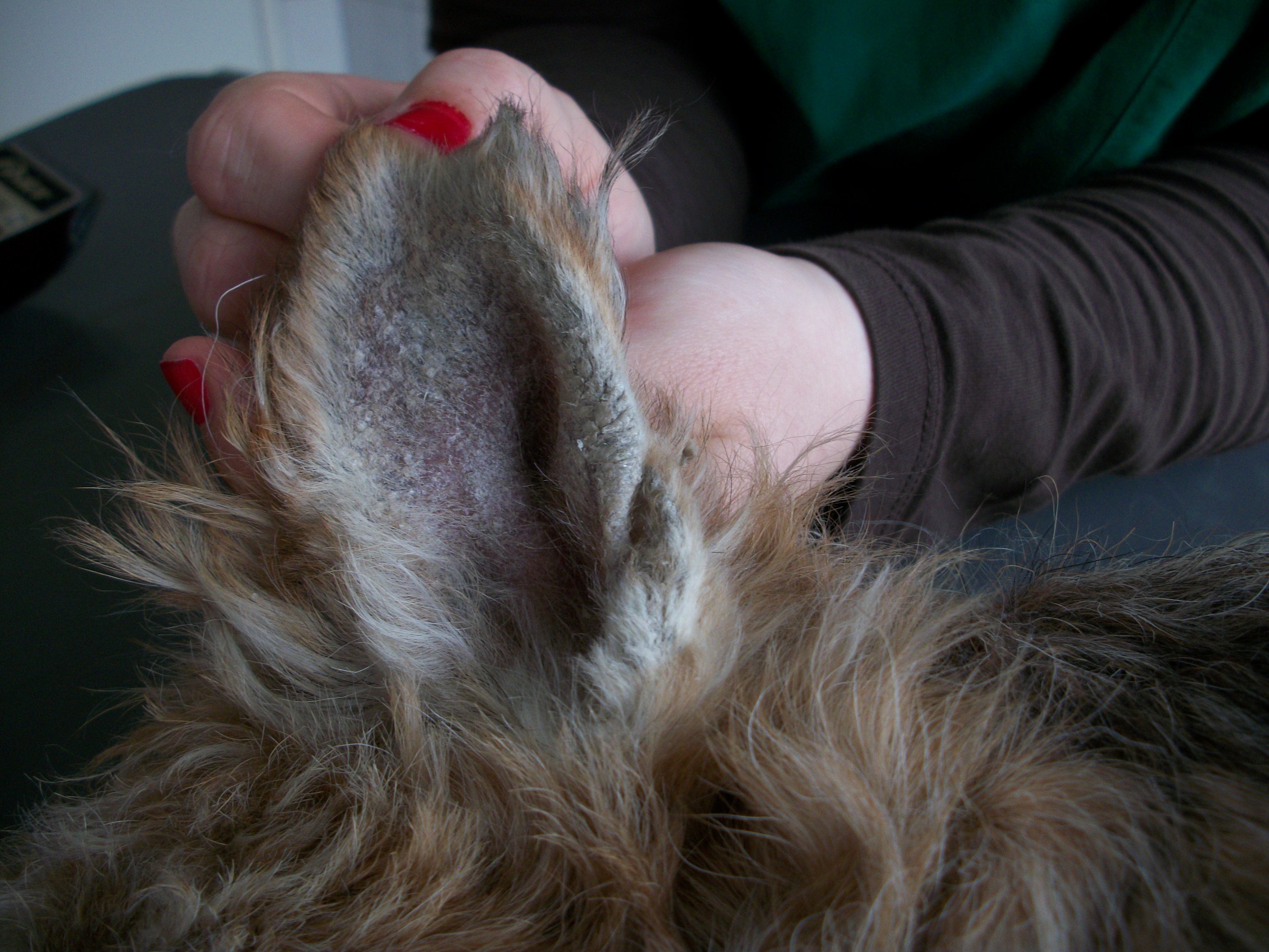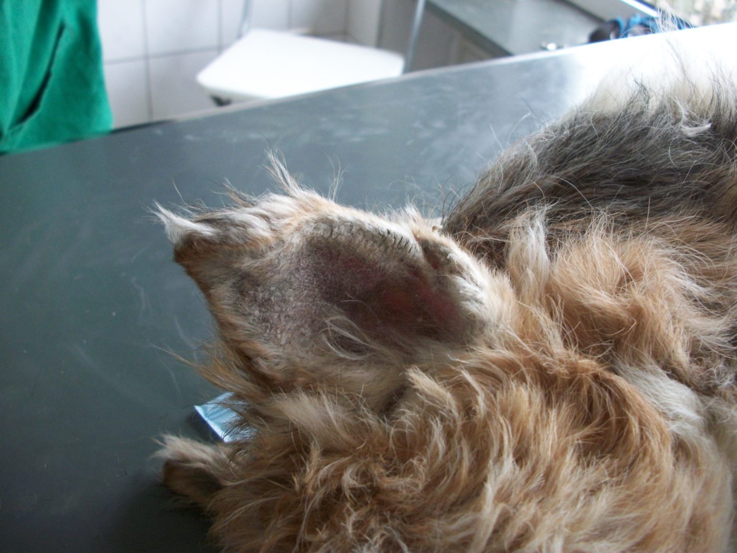 Als er acht Monate später erneut in meine Praxis kam, fiel mir sofort auf, wie stark sich sein Zustand verschlechtert hatte: Im Innern seiner Ohrmuscheln fanden sich dicke Krusten, außerdem zeigten sich Krusten um den Po herum und in vereinzelten Nestern auf dem Rücken. Die Pfoten waren deutlich gerötet. Allgemein schienen bei Remo die betroffenen Areale nicht besonders mit Juckreiz assoziiert zu sein, die Ohrmuscheln aber waren bei Untersuchung schmerzhaft.