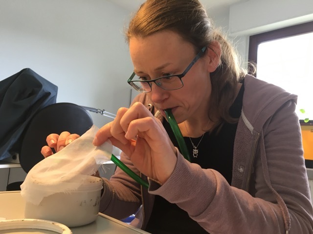 Dr. Torsten Naucke und seine Lebensgefährtin Susanne Lorentz züchten die kleinen, lästigen Sandmücken (Phlebotomus mascittii), die wiederum zur Grundlagenforschung von Infektionskrankheiten bei Tieren dienen. Neben fauligen Äpfeln benötigen die Tiere auch Blut, und dafür stellt der Parasitologe sein eigenes zur Verfügung. Alle zwei Wochen bietet er den Sandmücken seinen Arm an, die dann genüsslich saugen. Fünf Minuten lang. Und das Resultat juckt schrecklich und ist tatsächlich nicht zu übersehen. Zwei Millimeter klein sind die sandfarbenen Stechmücken, auf der Haut fast unsichtbar und fallen durch ihre großen schwarzen Augen auf. Nur die weiblichen Mücken saugen Blut, ohne den Saugakt ist ein Heranreifen der Eier bei den meisten Arten nicht möglich.