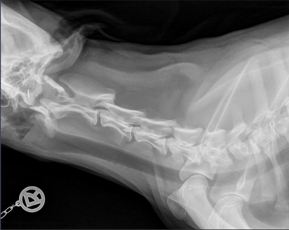 Um andere Ursachen für die Schmerzhaftigkeit auszuschließen, wurde bei Ronja ein Röntgenbild der Halswirbelsäule gemacht. Eine Möglichkeit für Schmerzhaftigkeit in der Halswirbelsäule kann auch eine Entzündung der Bandscheiben oder ein Bandscheibenvorfall sein. Dies konnte bei Ronja durch die röntgenologische Untersuchung ausgeschlossen werden.