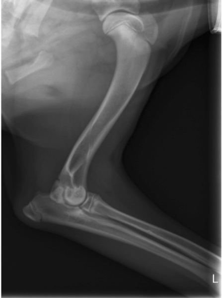 In der Klinik wurde der sechs Monate alter Golden Retriever-Mischlingsrüde "Aaron" vorgestellt, der seit vier bis sechs Wochen auf der linken Vordergliedmaße lahm ging, vor allem wenn er länger gelegen oder viel gespielt hatte. Aaron war als er in der Praxis vorgestellt wurde, altersgerecht geimpft und entwurmt, er fraß und trank normal und setzte normal Harn und Kot ab.