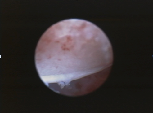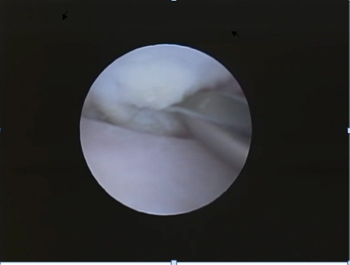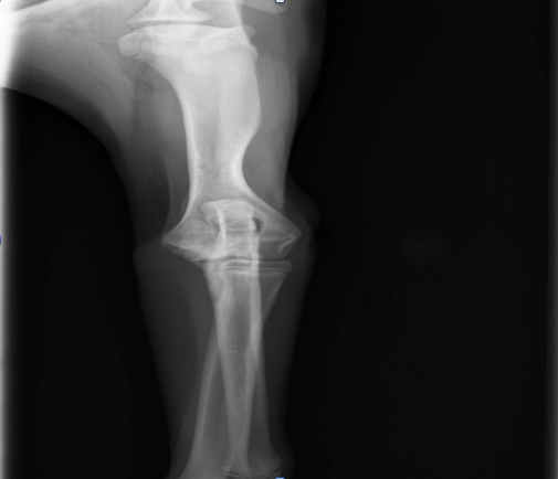 Aaron war munter und aufmerksam, sein Herz-Kreislauf-System und die Palpation des Abdomens waren unauffällig. Seine innere Körpertemperatur lag mit 38,9°C im physiologischen Bereich. Er ging hochgradig lahm auf der linken Vordergliedmaße. Bei der Palpation des linken Vorderbeines konnte man eine deutliche Gelenkfüllung und eine Schmerzhaftigkeit des Ellbogengelenks feststellen. Alle anderen Gelenke waren frei beweglich und nicht schmerzhaft. Es wurde eine Röntgenuntersuchung beider Ellenbögen und Schultern durchgeführt. Die Schultern stellten sich röntgenologisch völlig unauffällig dar. An beiden Ellenbögen konnten Veränderungen in Form einer Osteochondrosis dissecans (OCD = Knorpelveränderung) nachgewiesen werden, und der linke Ellbogen war hochgradig verdächtig für eine Ellbogendysplasie (ED) mit einem Frakturierten Processus Coronoideus medialis (FCP= abgebrochenes Knochenteil). Aufgrund der röntgenologischen Befunde wurden beide Ellenbögen arthroskopiert. Der Verdacht einer Ellbogendysplasie konnte in der Arthroskopie bestätigt werden. Das abgebrochene Knochenteil wurde entfernt und die Knorpelschuppen der OCD beidseits abgetragen.