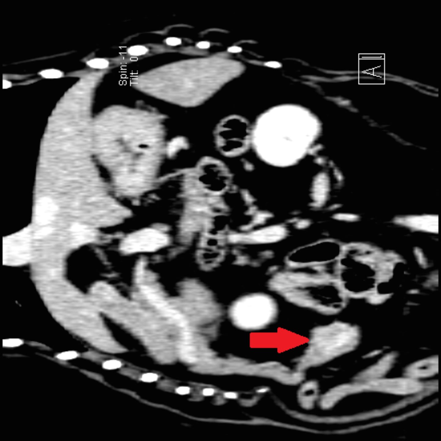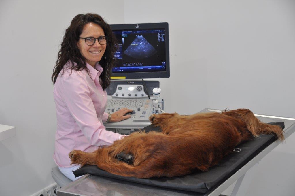 Tückischerweise sind Insulinome in den meisten Fällen sehr klein und sehr schwierig aufzufinden. Wir führten als nächstes eine systematische Suche nach dem Tumor durch. In der Regel sind insulin-ausschüttenden Geschwulste in der Bauchspeicheldrüse zu finden, jedoch können diese in seltenen Fällen auch in einer anderen Körperregion liegen. Zur Tumorsuche wird in der Tiermedizin standardmäßig zunächst ein Ultraschall des Bauchraums und Röntgenbilder des Brustkorbs in drei Ebenen durchgeführt. Ronjas Röntgenbilder der Lunge zeigten zum Glück keine Auffälligkeiten, jedoch konnte im dem Bereich der Bauchspeicheldrüse, der dem Zwölffingerdarm anliegt, eine verdächtige Stelle in der Ultraschalluntersuchung gefunden werden, die jedoch keine eindeutige Aussage zuließ.
