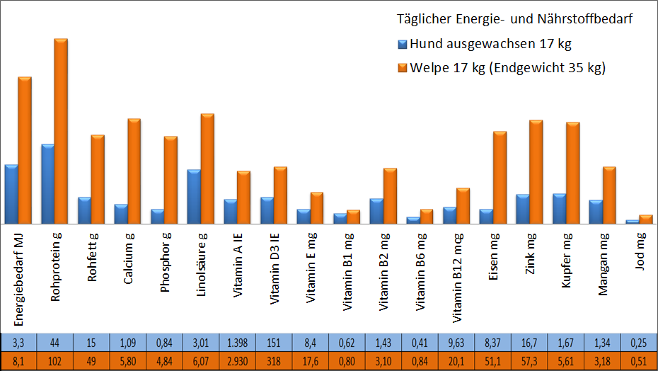 In den ersten Lebenswochen deckt die Milch der Hündin den Bedarf des Welpen an Proteinen, Fetten und Mineralien ab und wird durch die behutsame Beifütterung ab Ende der 3. Woche zunehmend ergänzt. Mit 12 Wochen ist das Verdauungssystem des Welpen so weit gereift, dass im Allgemeinen alle für Hunde geeigneten Futterstoffe angeboten werden können, wenngleich die Mengen, die Zusammensetzung und die Verdaulichkeit zu berücksichtigen sind. Ein Welpe mit einem Körpergewicht von 17 kg hat einen bis zu vierfach höheren Nährstoffbedarf gegenüber einem gleich schweren erwachsenen Hund (Abb.2).
