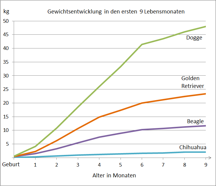 In der Hauptwachstumsphase, den ersten sechs bis acht Lebensmonaten, sind eine angemessene Fütterung und Haltung ausschlaggebend für die veranlagungsgemäße Entwicklung. Immerhin erreichen Welpen kleiner Hunderassen bereits im vierten Lebensmonat die Hälfte ihres endgültigen Körpergewichts. Großrassige Hundewelpen benötigen dafür einen längeren Zeitraum (Abb. 1). Für sie sind langsame Zuwachsraten anzustreben, um die Belastung der jungen Knochen, Gelenk- und Bindegewebsstrukturen zu begrenzen und orthopädischen Problemen vorzubeugen. Eine genaue Futterzuteilung ist daher unverzichtbar.
