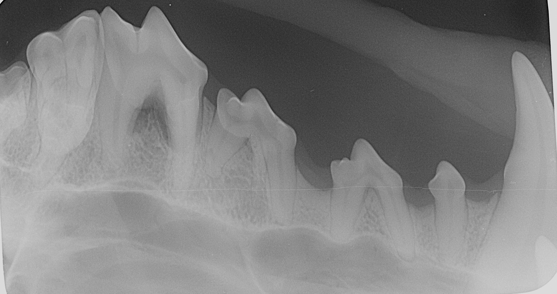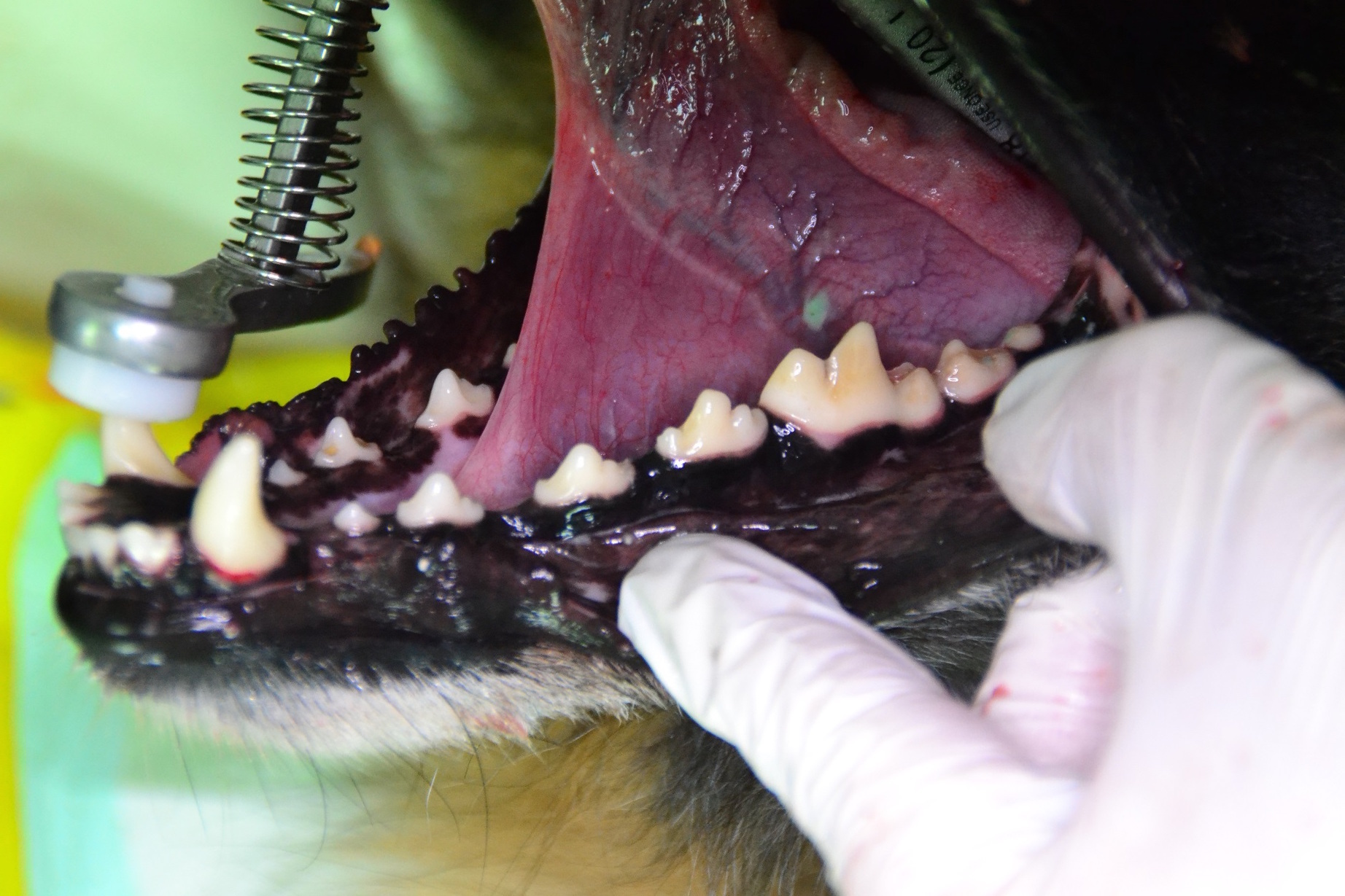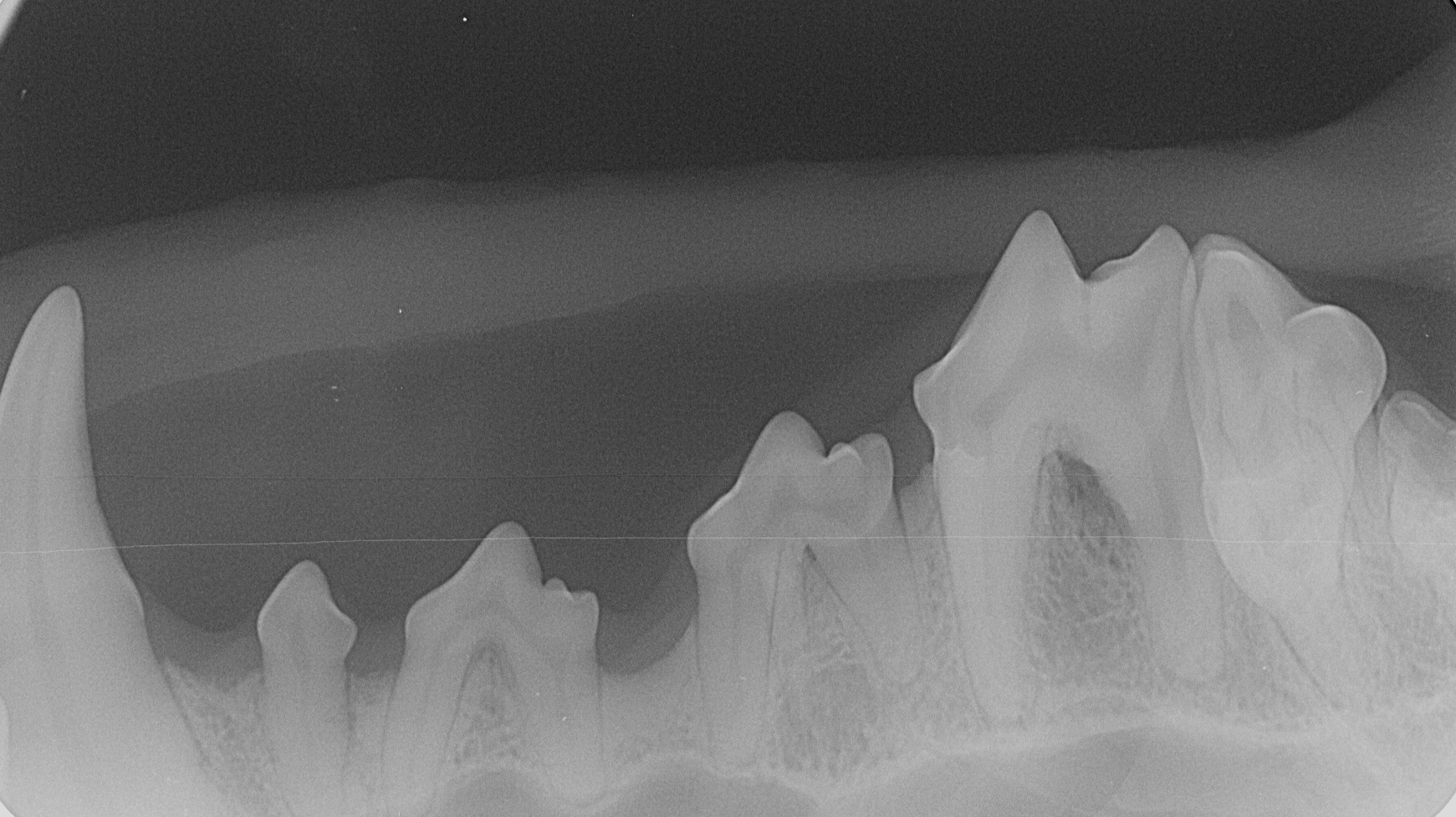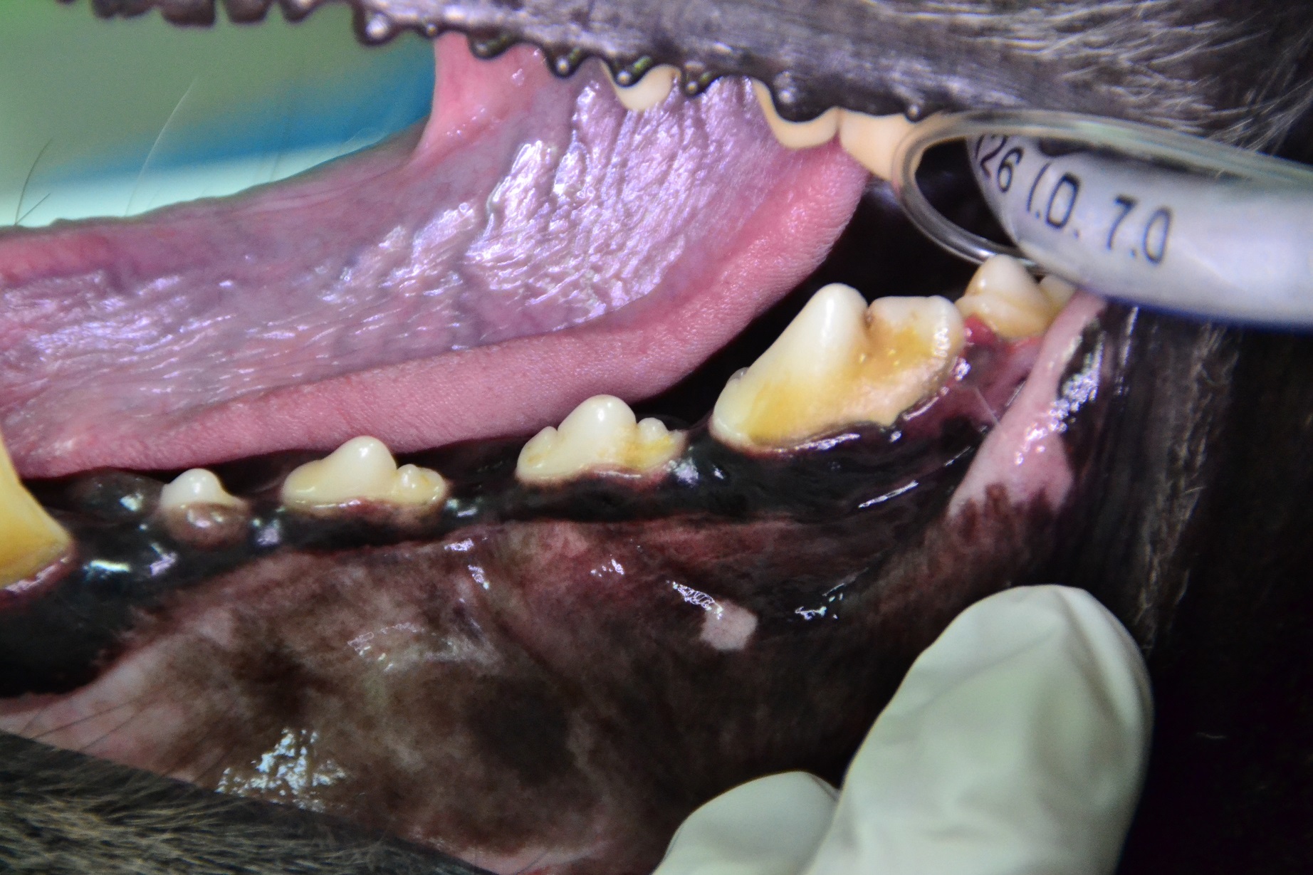 Für eine ordentliche Narkose wird standardmäßig die Inhalationsnarkose durchgeführt. Nachdem „Alyza“ intubiert wurde, wurden die Zähne geröntgt. Die Röntgenbilder zeigen eine deutliche Reduktion des Knochens. Die Zähne wurden von dem Belag befreit, die Zahnfleischtaschen mit Paradontalsonde untersucht. Die Befunde sprechen für beidseitige Paradontose der oberen vierten Prämolare (Backenzähne im Gebiss von Säugetieren). Die Zähne haben ihre Bezeichnungen bzw. Nummern. Diese Zähne heißen P4, genauer haben sie Nummern „108 und 208“, wo 1 für rechts oben, und 2 für links oben steht, und Nummer 8 ist die Zahnnummer auf der entsprechenden Seite.
