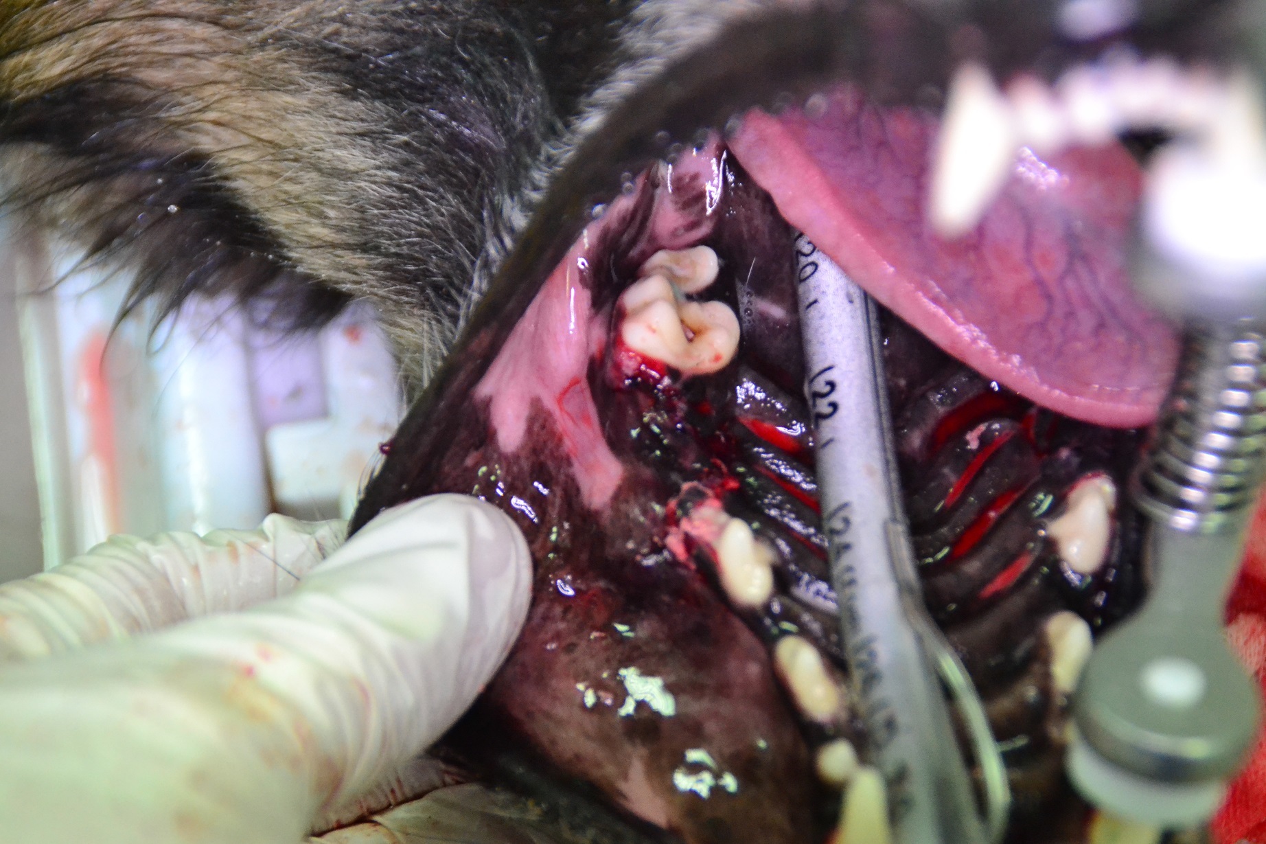 Leider ist die Paradontose nicht heilbar - die entsprechende Behandlung in diesem Fall ist eine Extraktion (lateinisch extrahere: ‚herausziehen, entnehmen‘). Die betroffenen Zähne haben drei sehr lange Wurzeln, deswegen müssen sie vor der Extraktion zerteilt werden, und jede Wurzel wird einzeln aus der Alveole (aus lat. alveolus für „kleine Mulde“ - Zahnfach, Teil des Kieferknochens) gezogen. Damit keine Wurzelüberreste im Körper bleiben, werden Zahnfleisch und Kieferknochen entsprechend präpariert. Die Operationswunde muss nach einer solchen Operation sorgfältig verschlossen werden. „Alyza“ darf jetzt nach der Narkose aufwachen. Mit dieser Art der Betäubung geht es relativ schnell. Da die Zahnarztinstrumente mit Druckluft und Wasser betrieben werden, besteht bei der Inhalationsnarkose keine Gefahr, dass Wasser oder Zahnteile in die Luftröhre geraten.