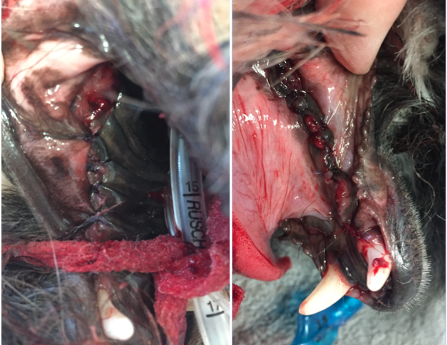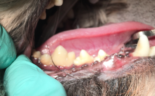 Die Wunden wurden alle sorgfältig kürretiert (dabei wurden mit einem scharfen Löffel Gewebereste und Schmutz entfernt), gespült und das Zahnfleisch in Einzelheften vernäht. Das Nahtmaterial hierfür sollte resorbierbar, monofil und mit atraumatischer Nadel sein, damit es das empfindliche Zahnfleisch so wenig wie möglich verletzt.